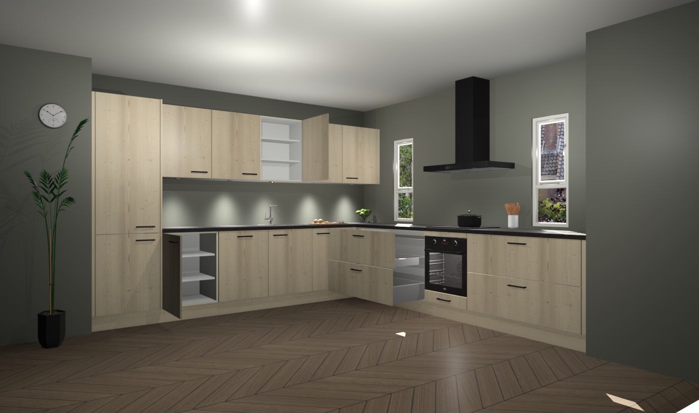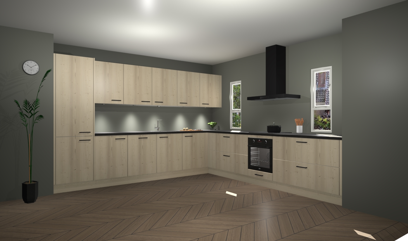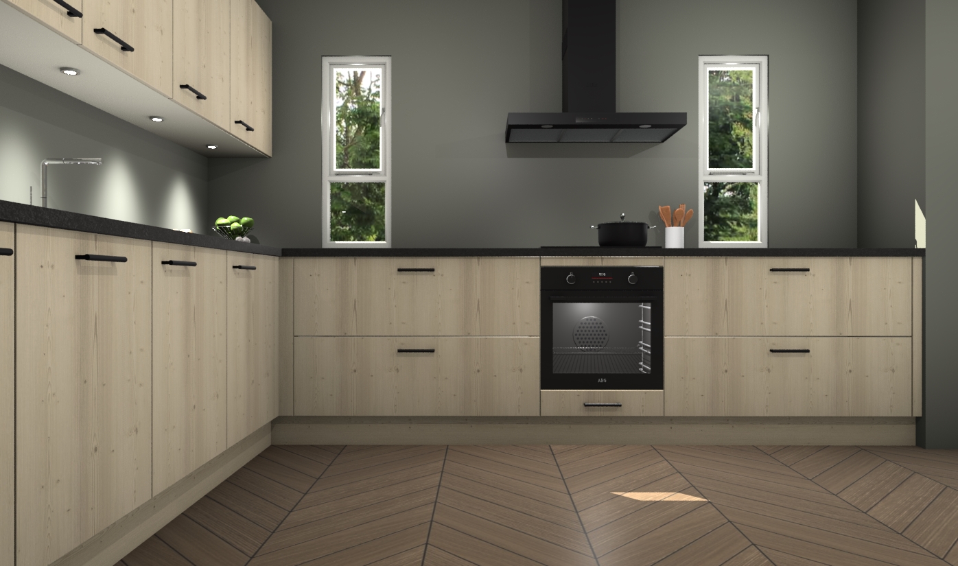 De vuren keuken is een ideale hoekkeuken en heeft alle functies en apparatuur die u maar nodig kunt hebben. Bij de bestelling krijgt u een oven, inductiekookplaat, afzuigkap, vaatwasser en koelkast - deze kunnen desgewenst eenvoudig worden uitgebreid naar AEG na bestellen. Elke kast wordt ook voor gemonteerd geleverd met soft close deuren die jarenlang gebruik beloven. Stelt u zich voor dat u geen gedoe heeft met vervelende montage - vanaf het moment dat u uw bestelling plaats, duurt het slechts 7 weken voor het bij u thuis geleverd wordt.
