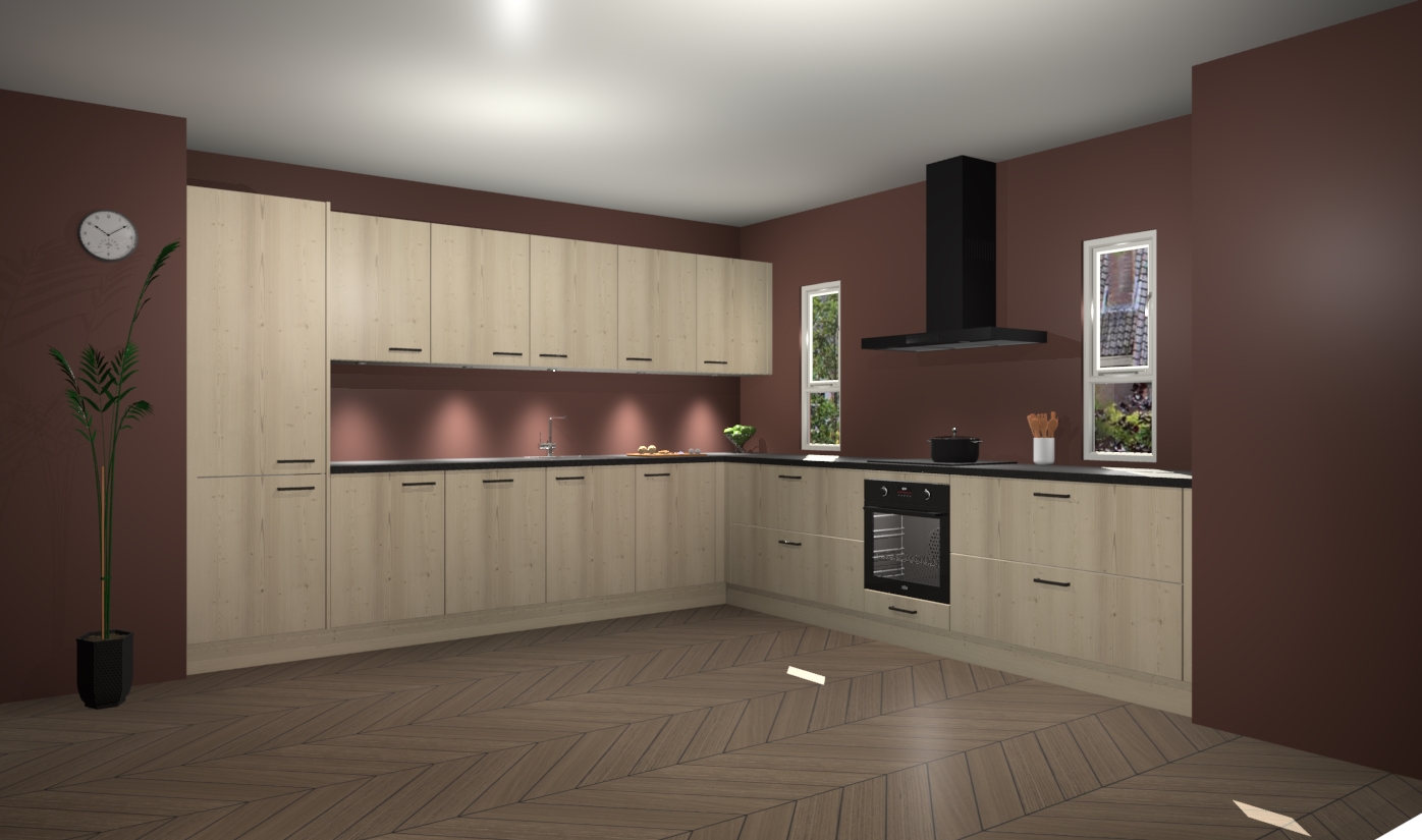 De vuren keuken is een ideale hoekkeuken en heeft alle functies en apparatuur die u maar nodig kunt hebben. Bij de bestelling krijgt u een oven, inductiekookplaat, afzuigkap, vaatwasser en koelkast - deze kunnen desgewenst eenvoudig worden uitgebreid naar AEG na bestellen. Elke kast wordt ook voor gemonteerd geleverd met soft close deuren die jarenlang gebruik beloven. Stelt u zich voor dat u geen gedoe heeft met vervelende montage - vanaf het moment dat u uw bestelling plaats, duurt het slechts 7 weken voor het bij u thuis geleverd wordt.