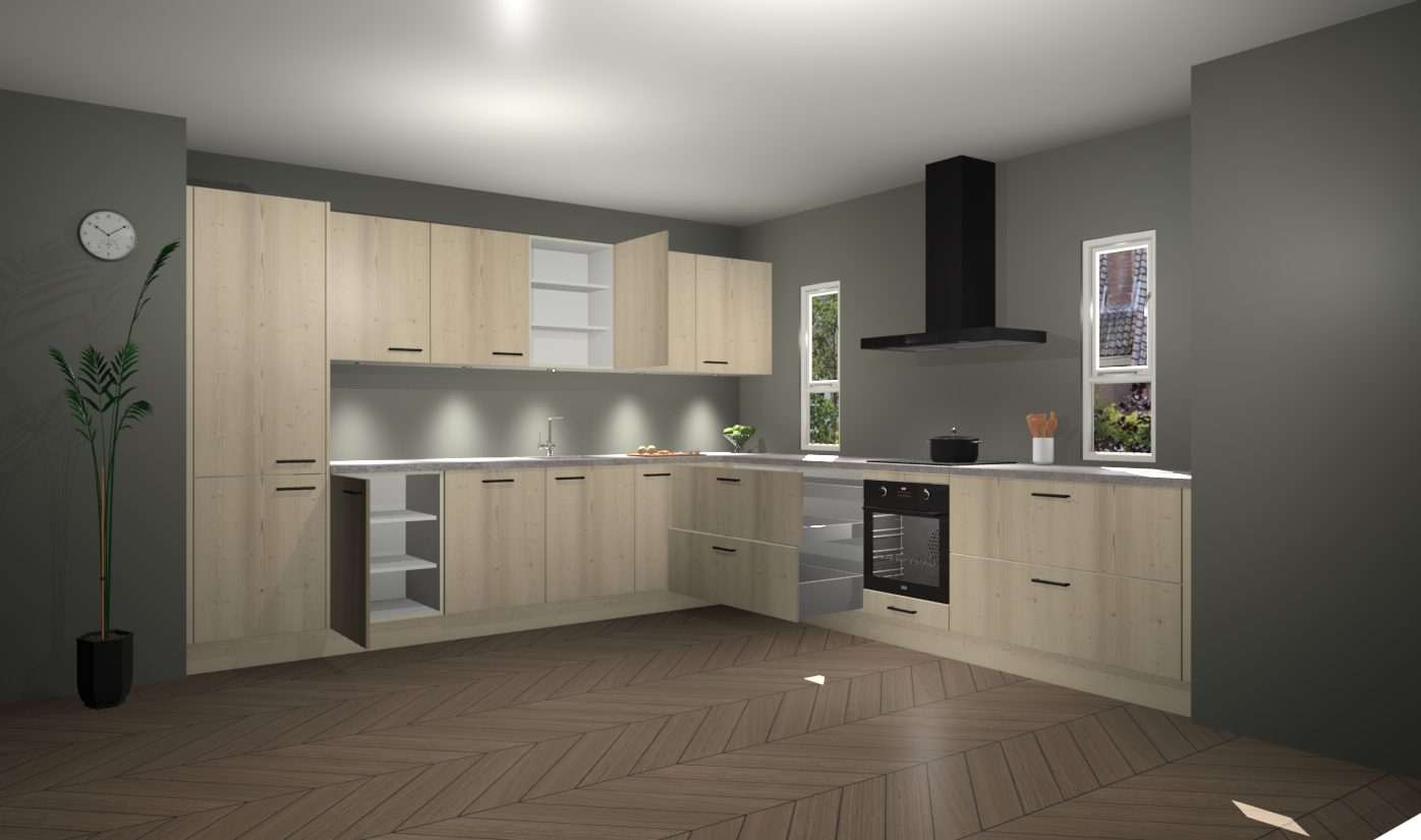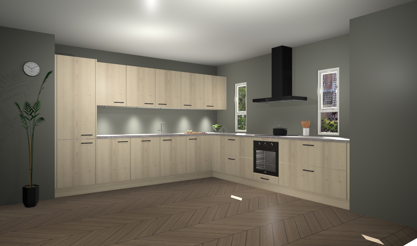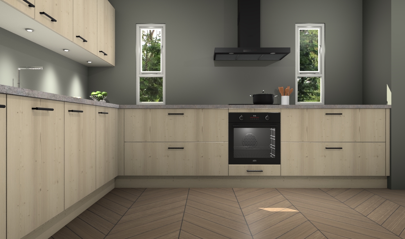 De vuren keuken is een ideale hoekkeuken en heeft alle functies en apparatuur die u maar nodig kunt hebben. Bij de bestelling krijgt u een oven, inductiekookplaat, afzuigkap, vaatwasser en koelkast - deze kunnen desgewenst eenvoudig worden uitgebreid naar AEG na bestellen. Elke kast wordt ook voor gemonteerd geleverd met soft close deuren die jarenlang gebruik beloven. Stelt u zich voor dat u geen gedoe heeft met vervelende montage - vanaf het moment dat u uw bestelling plaats, duurt het slechts 7 weken voor het bij u thuis geleverd wordt.