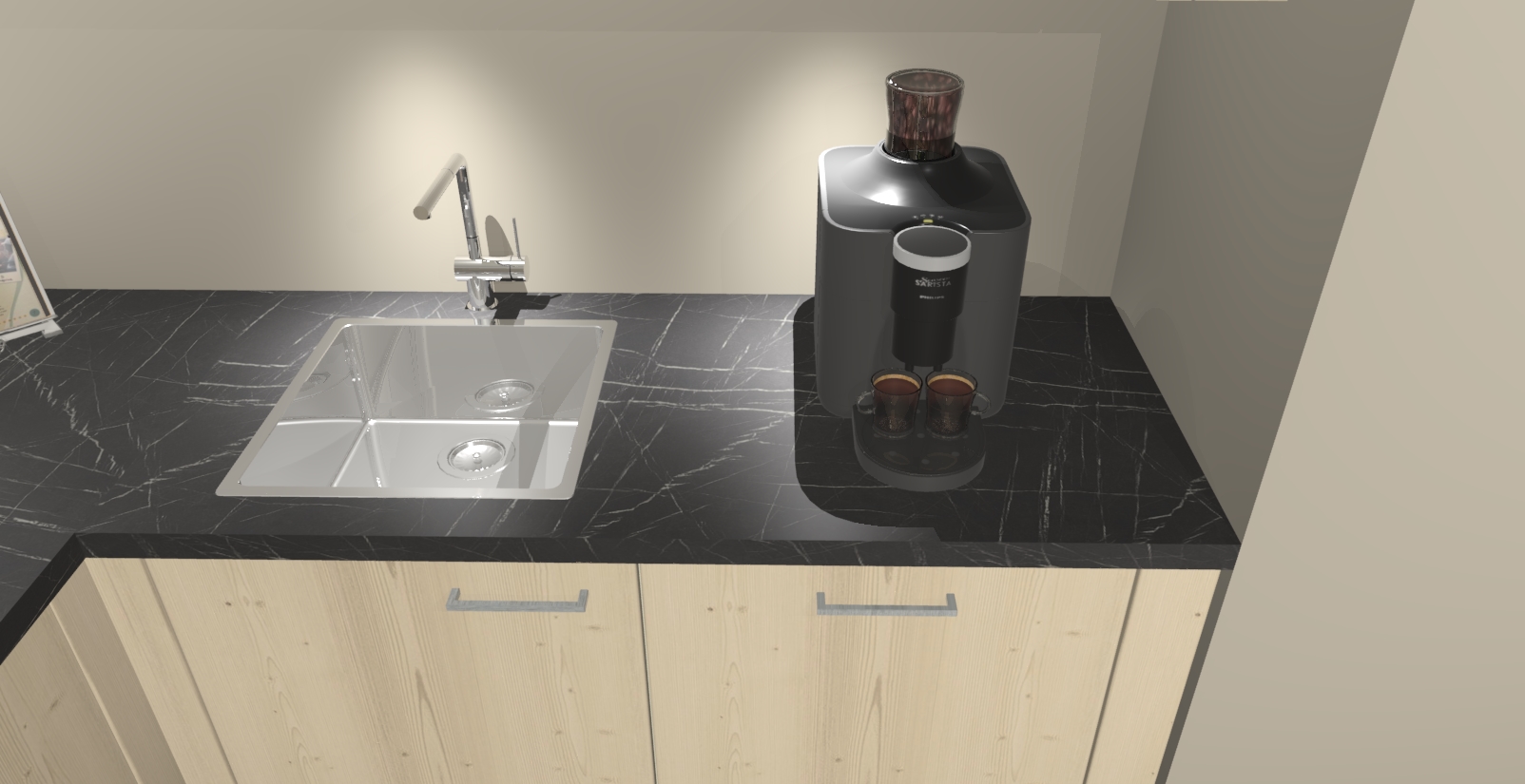 - De spoelbak is nog niet in gevreesd. Dit dient tijdens het werk gedaan te worden