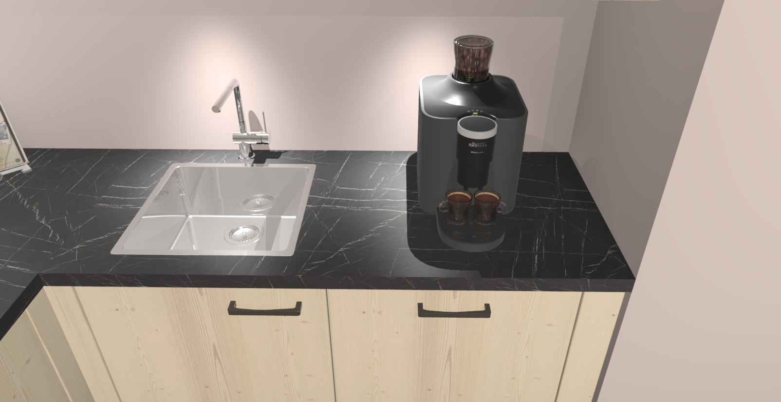 • De spoelbak is nog niet in gevreesd. Dit dient tijdens het werk gedaan te worden