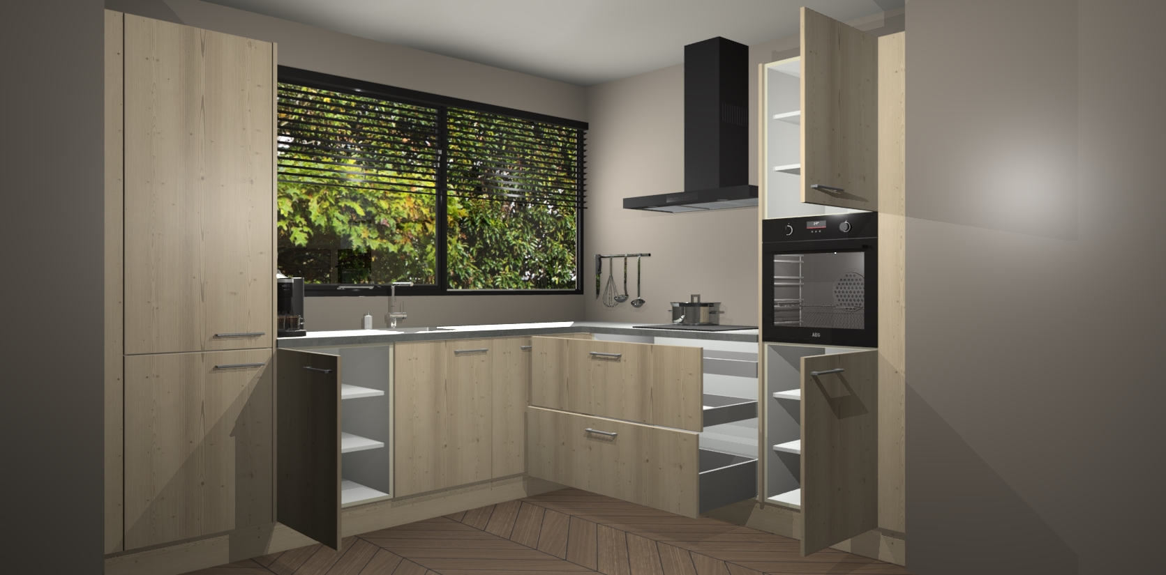 Met een modern, tijdloos design en ruime opslagruimte, zult u zich in no-time thuis voelen in uw nieuwe keuken. Uw leven wordt eenvoudiger met de soft-close deuren die voor het ultieme stille comfort zorgen - geen geluid dat u stoort terwijl u kookt. Ook is de keuken voorzien van 5 ingebouwde apparaten: een oven, inductie kookplaat, afzuigkap, vaatwasser en koelkast. Deze kunnen gemakkelijk na bestelling worden bijgewerkt naar AEG - waardoor uw luxe ervaring compleet is.