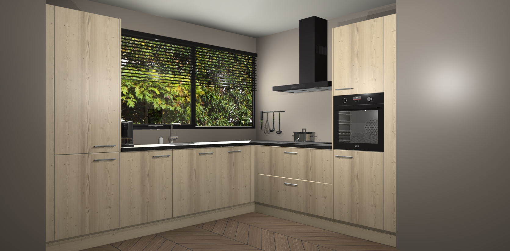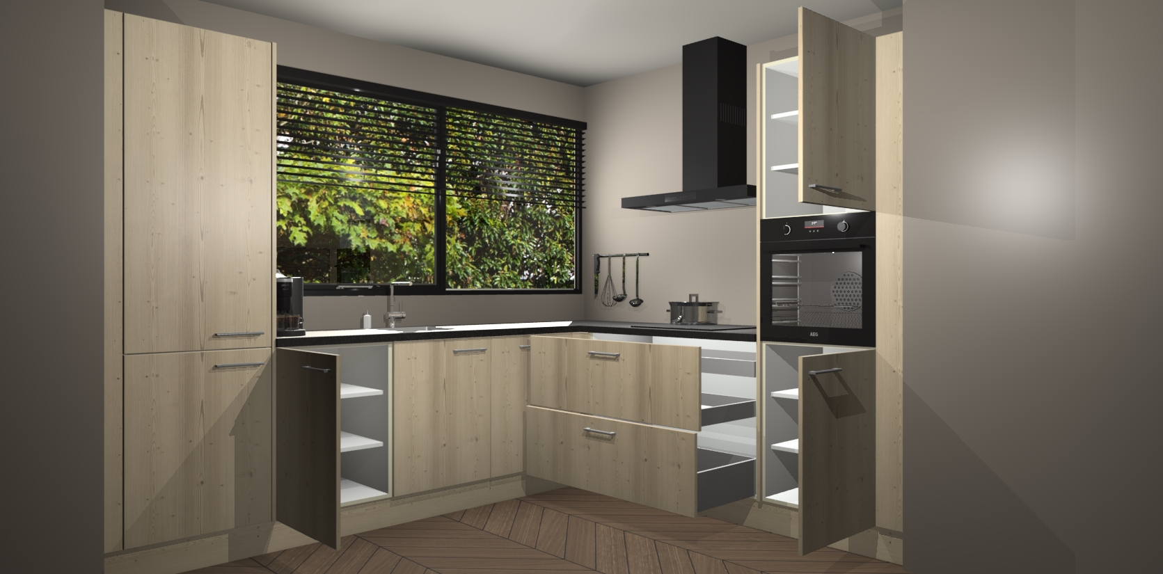 Met een modern, tijdloos design en ruime opslagruimte, zult u zich in no-time thuis voelen in uw nieuwe keuken. Uw leven wordt eenvoudiger met de soft-close deuren die voor het ultieme stille comfort zorgen - geen geluid dat u stoort terwijl u kookt. Ook is de keuken voorzien van 5 ingebouwde apparaten: een oven, inductie kookplaat, afzuigkap, vaatwasser en koelkast. Deze kunnen gemakkelijk na bestelling worden bijgewerkt naar AEG - waardoor uw luxe ervaring compleet is.