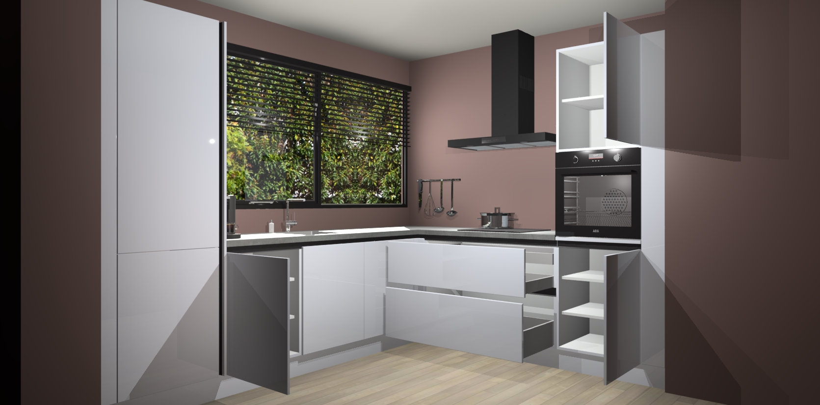 Met een modern, tijdloos design en ruime opslagruimte, zult u zich in no-time thuis voelen in uw nieuwe keuken. Uw leven wordt eenvoudiger met de soft-close deuren die voor het ultieme stille comfort zorgen - geen geluid dat u stoort terwijl u kookt. Ook is de keuken voorzien van 5 ingebouwde apparaten: een oven, inductie kookplaat, afzuigkap, vaatwasser en koelkast. Deze kunnen gemakkelijk na bestelling worden bijgewerkt naar AEG - waardoor uw luxe ervaring compleet is.