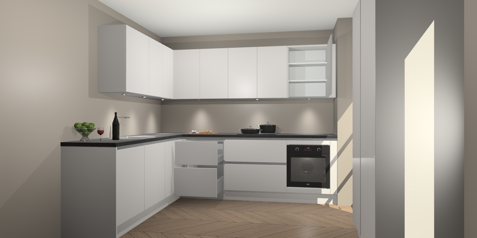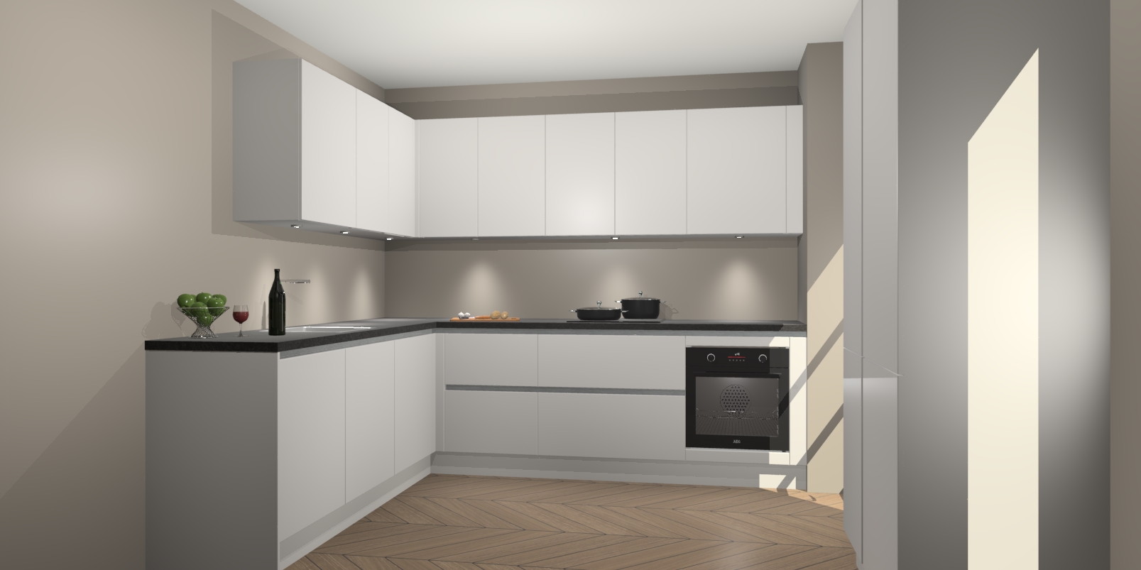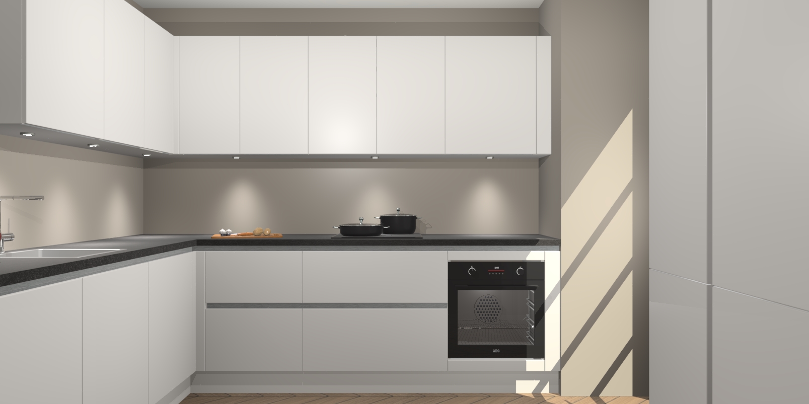 Met een modern, tijdloos design en ruime opslagruimte, zult u zich in no-time thuis voelen in uw nieuwe keuken. Uw leven wordt eenvoudiger met de soft-close deuren die voor het ultieme stille comfort zorgen - geen geluid dat u stoort terwijl u kookt. Ook is de keuken voorzien van 5 ingebouwde apparaten: een oven, inductie kookplaat, afzuigkap, vaatwasser en koelkast. Deze kunnen gemakkelijk na bestelling worden bijgewerkt naar AEG - waardoor uw luxe ervaring compleet is.