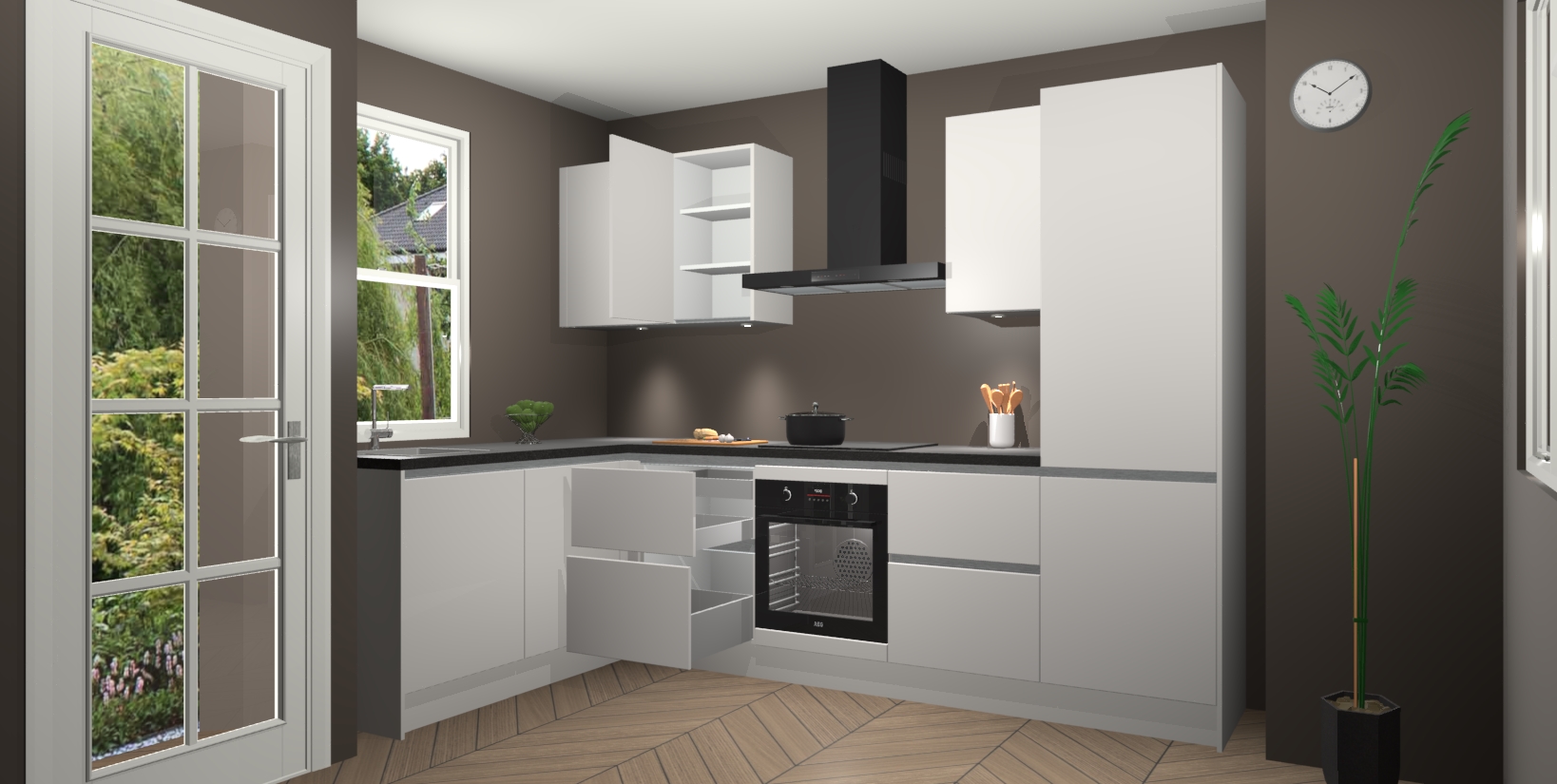 U hoeft zich ook geen zorgen te maken over een gebrek aan opbergruimte, want deze keuken heeft voldoende opbergmogelijkheden zowel boven als onder het aanrecht. Om het leven nog makkelijker te maken, wordt deze moderne hoekkeuken geleverd met 5 ingebouwde apparaten, waaronder een oven, inductiekookplaat, afzuigkap, vaatwasser en koelkast, zodat u in een mum van tijd klaar bent voor actie!