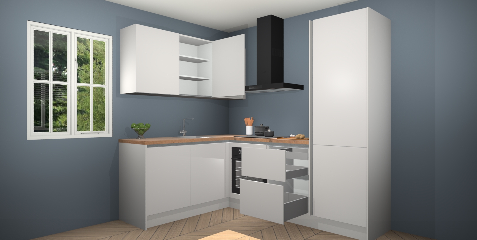 Voor nog meer gemak heeft deze keuken vijf ingebouwde apparaten - oven, inductiekookplaat, afzuigkap, vaatwasser en koelkast. Bovendien hebben alle kasten softclose deuren voor extra comfort bij het sluiten. Dit alles voor een verrassend lage vaste prijs - u vindt nergens anders een betere deal!
