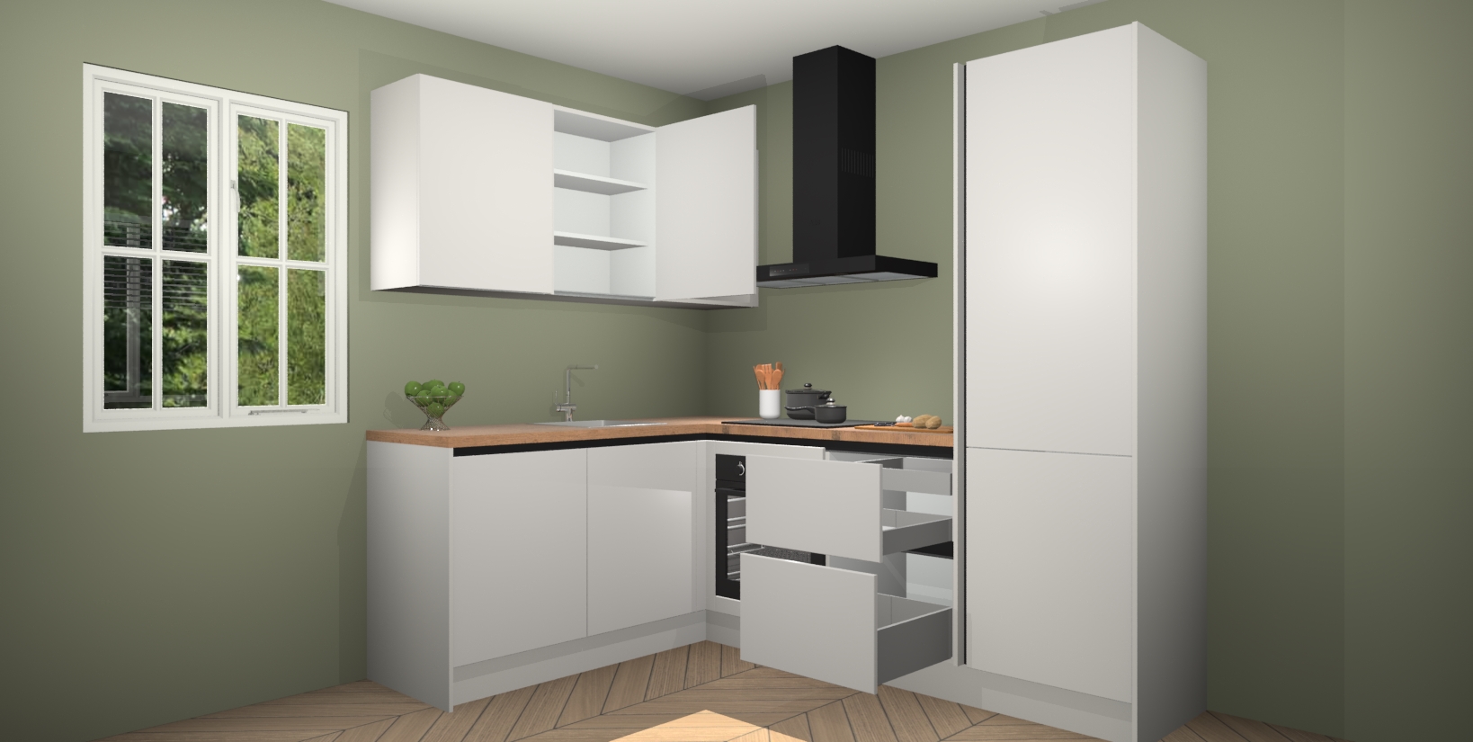 Voor nog meer gemak heeft deze keuken vijf ingebouwde apparaten - oven, inductiekookplaat, afzuigkap, vaatwasser en koelkast. Bovendien hebben alle kasten softclose deuren voor extra comfort bij het sluiten. Dit alles voor een verrassend lage vaste prijs - u vindt nergens anders een betere deal!