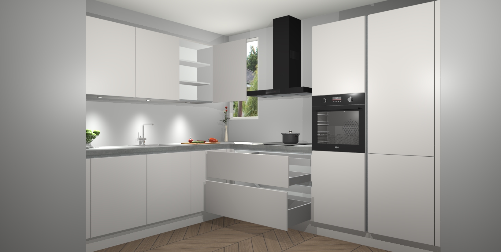 De ruime opbergruimte van dit model maakt het bereiden van voedsel en het gebruik van apparaten snel en gemakkelijk. Het beste van alles is dat het wordt geleverd met vijf inbouwapparaten: een oven, inductiekookplaat, afzuigkap, vaatwasser en koelkast - die allemaal gemakkelijk kunnen worden opgewaardeerd naar AEG na aankoop. Wat de gemaksfactor nog groter maakt, is het feit dat alle cabines voorgemonteerd worden geleverd, zodat u er meteen mee aan de slag kunt!