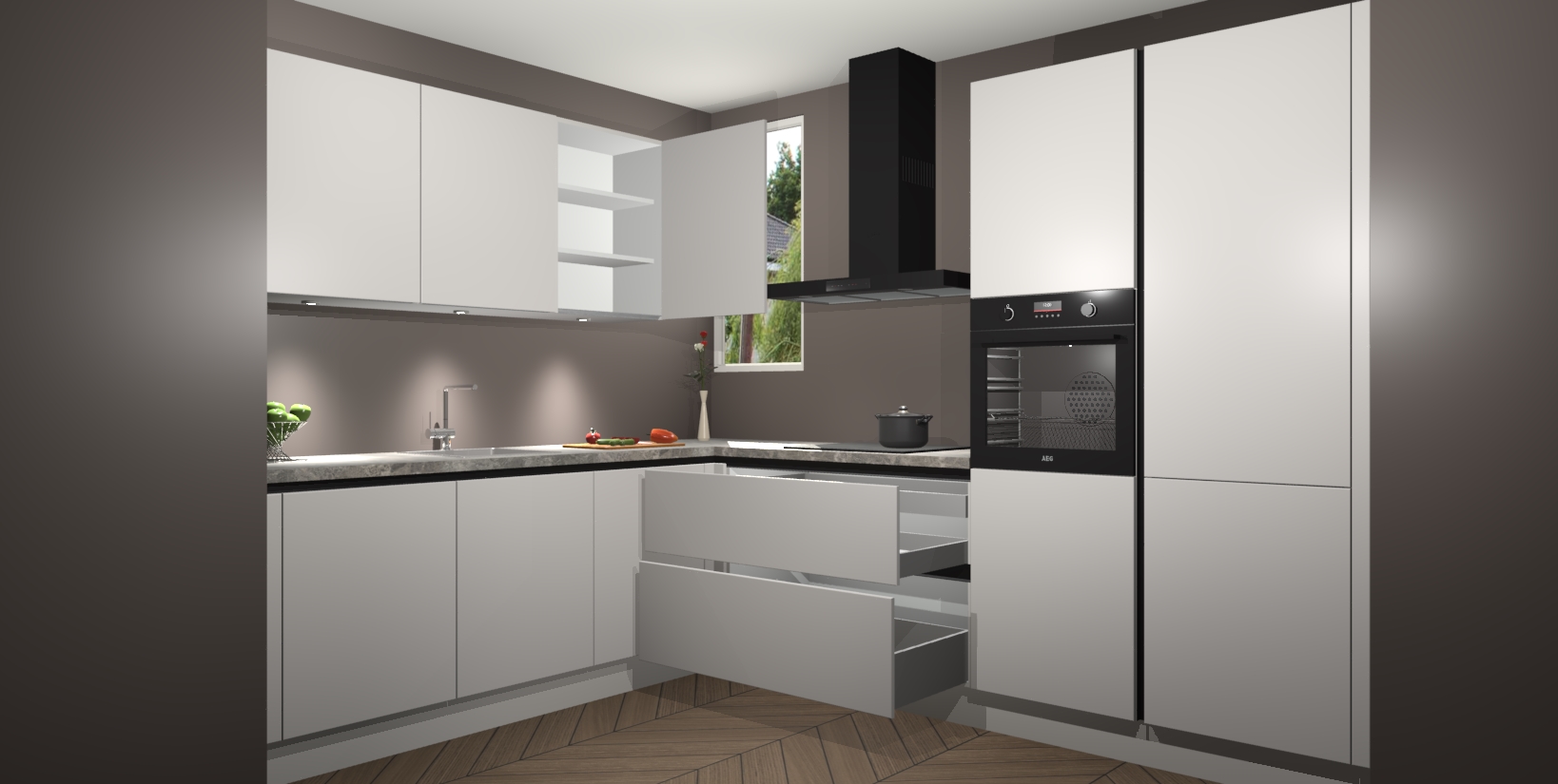De ruime opbergruimte van dit model maakt het bereiden van voedsel en het gebruik van apparaten snel en gemakkelijk. Het beste van alles is dat het wordt geleverd met vijf inbouwapparaten: een oven, inductiekookplaat, afzuigkap, vaatwasser en koelkast - die allemaal gemakkelijk kunnen worden opgewaardeerd naar AEG na aankoop. Wat de gemaksfactor nog groter maakt, is het feit dat alle cabines voorgemonteerd worden geleverd, zodat u er meteen mee aan de slag kunt!