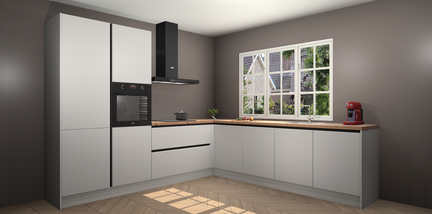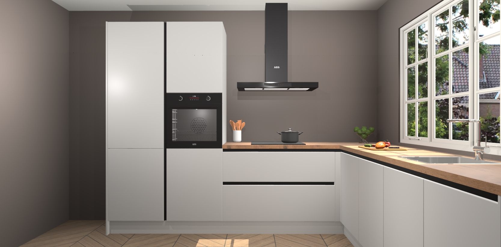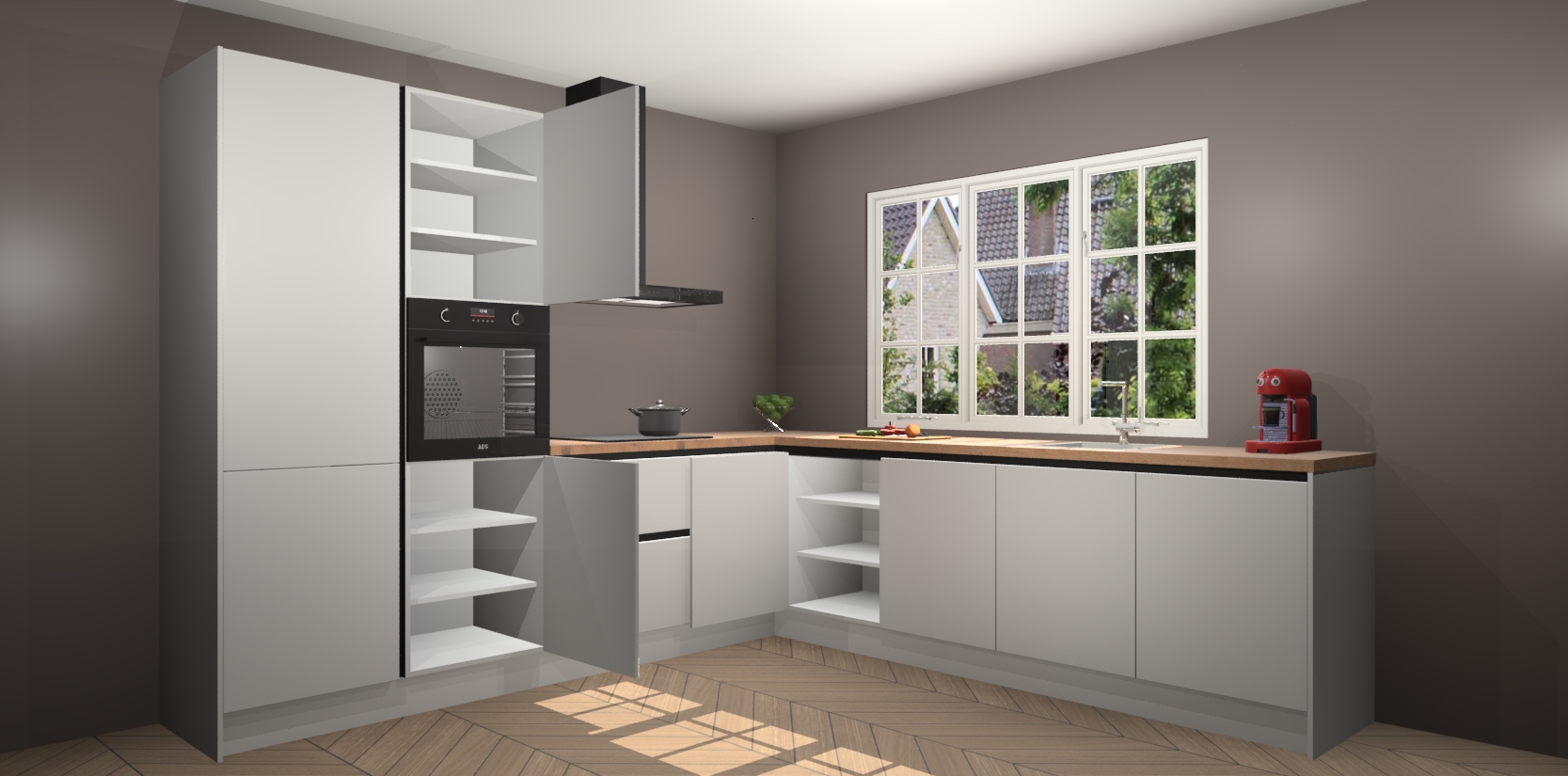 De keuken heeft veel opbergruimte, waardoor u alle ingrediënten gemakkelijk bereikbaar hebt staan. En daarnaast bevat deze volledig uitgeruste keuken ook 5 ingebouwde apparaten: een oven, inductiekookplaat, afzuigkap, vaatwasser en koelkast. Deze zijn heel eenvoudig na bestellen te upgraden naar AEG als u dit wilt. Bovendien zijn de softclose-kastdeuren ideaal; geef ze gewoon even een tikje en ze sluiten automatisch met geruisloze precisie.
