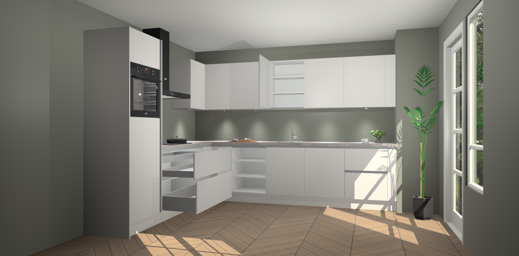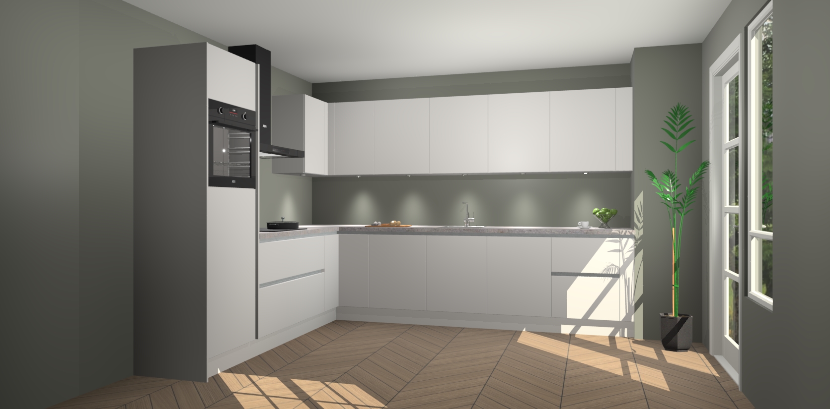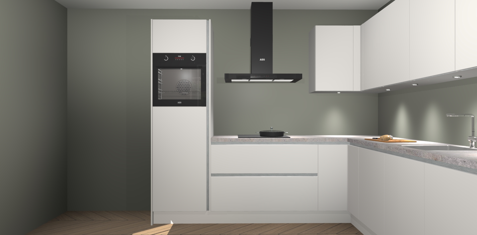 De Zijdegrijze greeploze keuken Debar is uitgerust met vijf inbouwapparaten die elke kooktaak handig en efficiënt maken. Een oven, inductiekookplaat, afzuigkap, vaatwasser en koelkast zijn standaard, maar kunnen na bestelling eenvoudig worden geupgrade naar AEG. Profiteer vervolgens van de softclose deuren voor snelle toegang en geruisloze toegang.