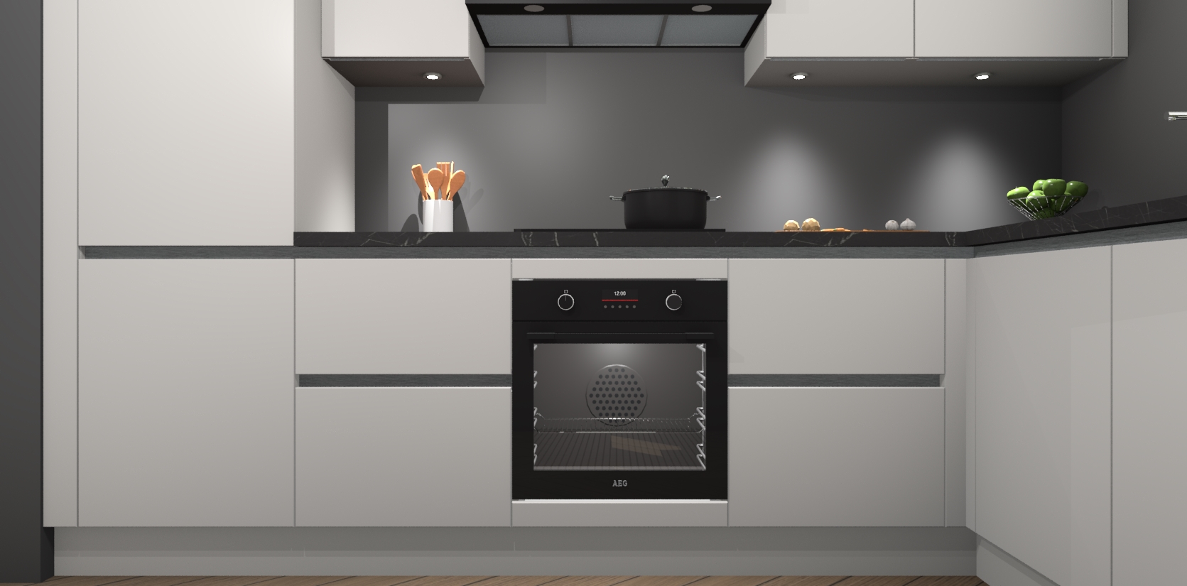 De Zijdegrijze greeploze keuken Geneve is uitgerust met 5 inbouwapparaten - een oven, inductiekookplaat, afzuigkap, vaatwasser en koelkast - voor al uw kook- en bewaarbehoeftes. U kunt deze apparaten desgewenst eenvoudig upgraden naar AEG of de oven omruilen voor een combimagnetron na het plaatsen van uw bestelling. En met de soft close deuren, voldoende opbergruimte en kasten die voorgemonteerd worden geleverd, bent u in een mum van tijd klaar om heerlijke maaltijden te bereiden!