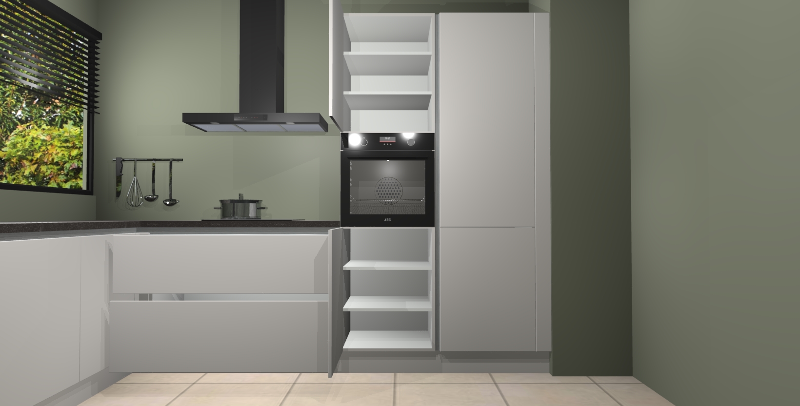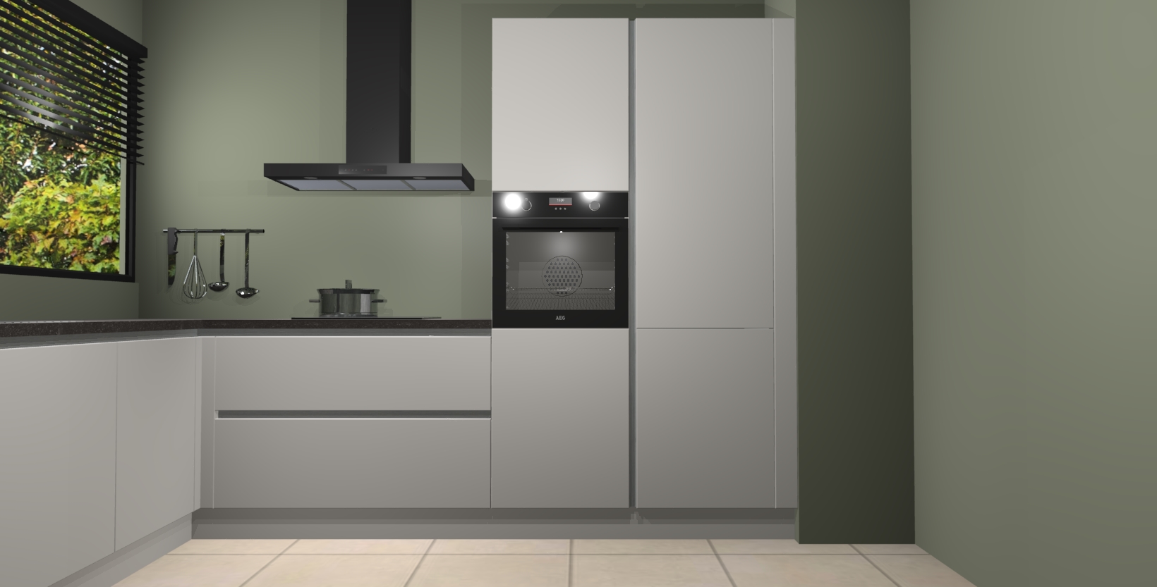 Met een modern, tijdloos design en ruime opslagruimte, zult u zich in no-time thuis voelen in uw nieuwe keuken. Uw leven wordt eenvoudiger met de soft-close deuren die voor het ultieme stille comfort zorgen - geen geluid dat u stoort terwijl u kookt. Ook is de keuken voorzien van 5 ingebouwde apparaten: een oven, inductie kookplaat, afzuigkap, vaatwasser en koelkast. Deze kunnen gemakkelijk na bestelling worden bijgewerkt naar AEG - waardoor uw luxe ervaring compleet is.