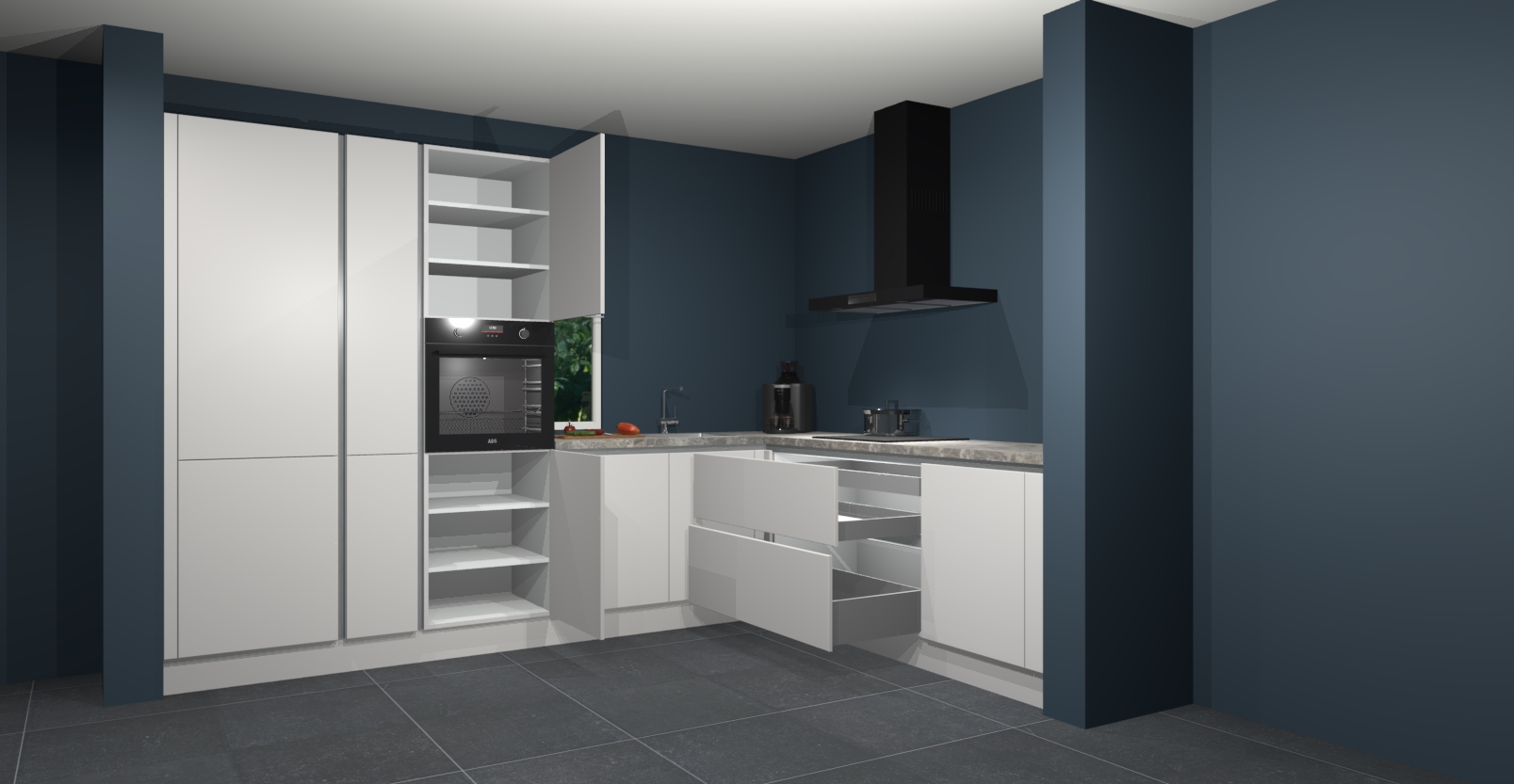 Met een modern, tijdloos design en ruime opslagruimte, zult u zich in no-time thuis voelen in uw nieuwe keuken. Uw leven wordt eenvoudiger met de soft-close deuren die voor het ultieme stille comfort zorgen - geen geluid dat u stoort terwijl u kookt. Ook is de keuken voorzien van 5 ingebouwde apparaten: een oven, inductie kookplaat, afzuigkap, vaatwasser en koelkast. Deze kunnen gemakkelijk na bestelling worden bijgewerkt naar AEG - waardoor uw luxe ervaring compleet is.