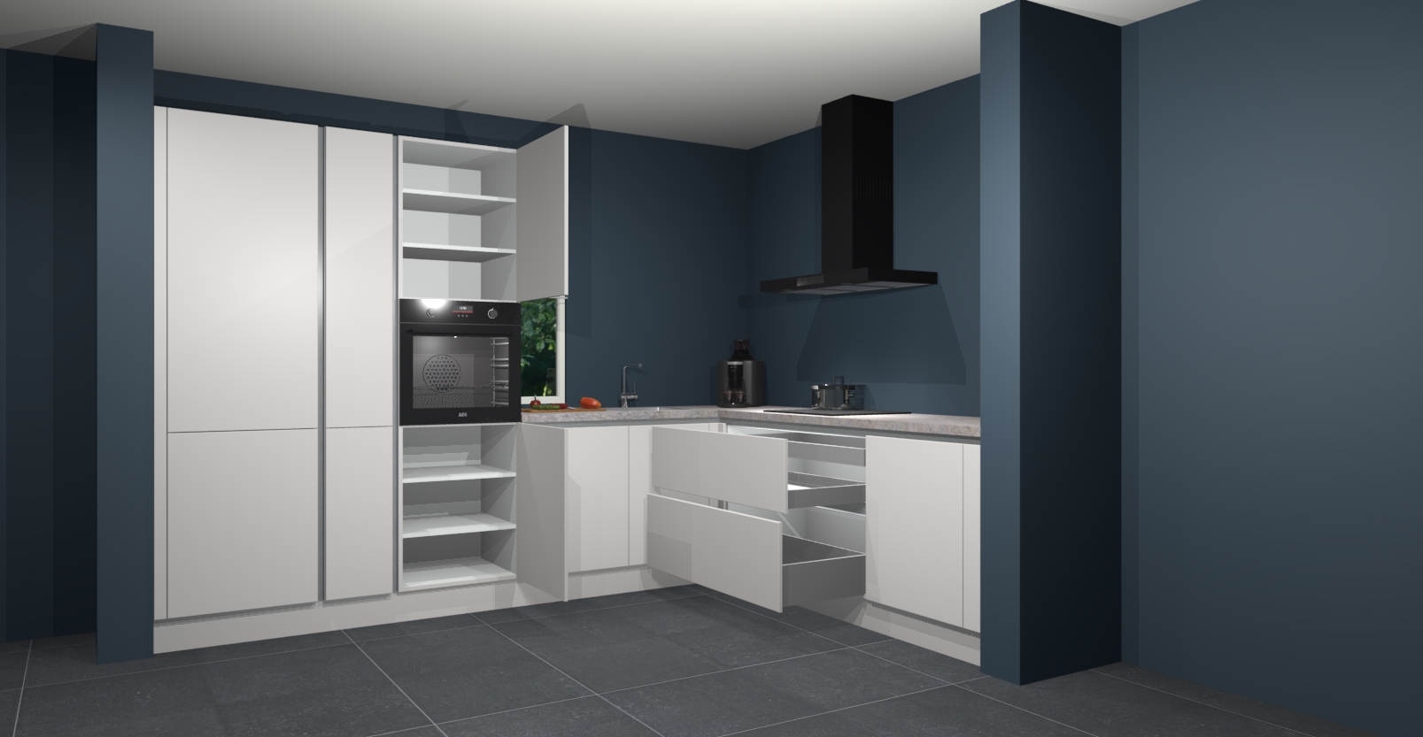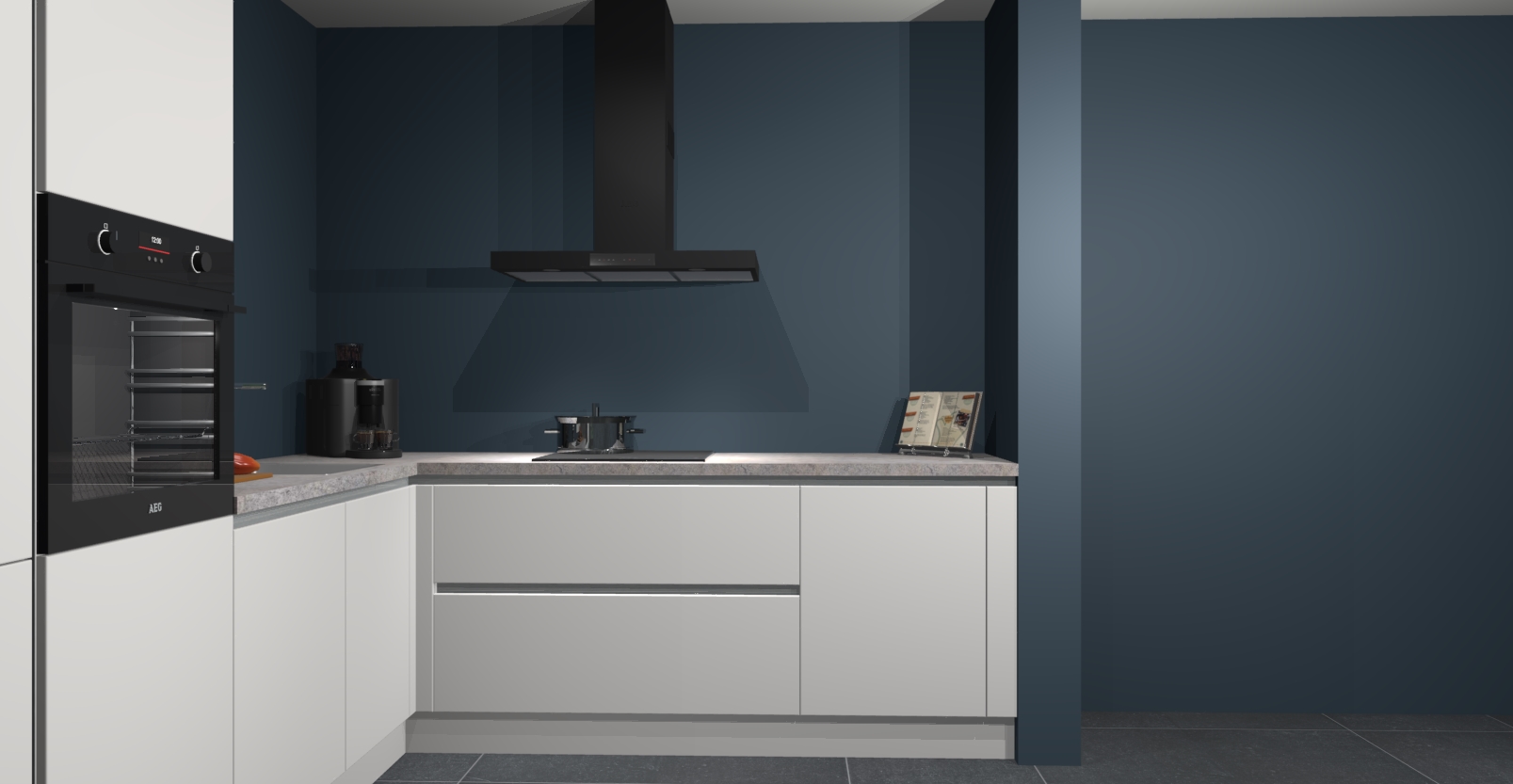 Met een modern, tijdloos design en ruime opslagruimte, zult u zich in no-time thuis voelen in uw nieuwe keuken. Uw leven wordt eenvoudiger met de soft-close deuren die voor het ultieme stille comfort zorgen - geen geluid dat u stoort terwijl u kookt. Ook is de keuken voorzien van 5 ingebouwde apparaten: een oven, inductie kookplaat, afzuigkap, vaatwasser en koelkast. Deze kunnen gemakkelijk na bestelling worden bijgewerkt naar AEG - waardoor uw luxe ervaring compleet is.
