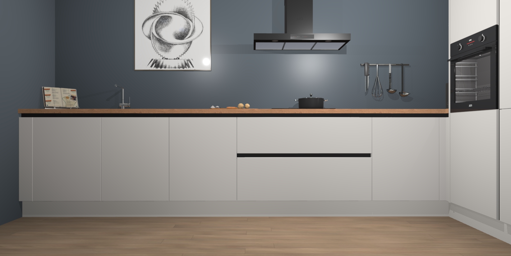 Welkom bij de Zijdegrijze greeploze keuken Khao Lak. Deze prachtige keuken zal de komende jaren het middelpunt van de belangstelling in uw huis zijn. Uitgerust met vijf inbouwapparaten komt u nooit kookgereedschap tekort. Bovendien geeft de warme houtlook elke ruimte een uitnodigende en tijdloze uitstraling.