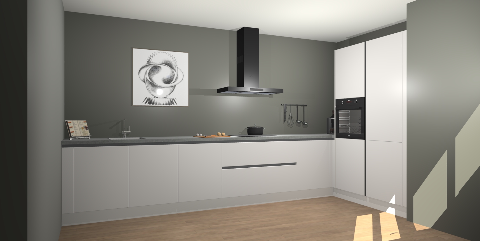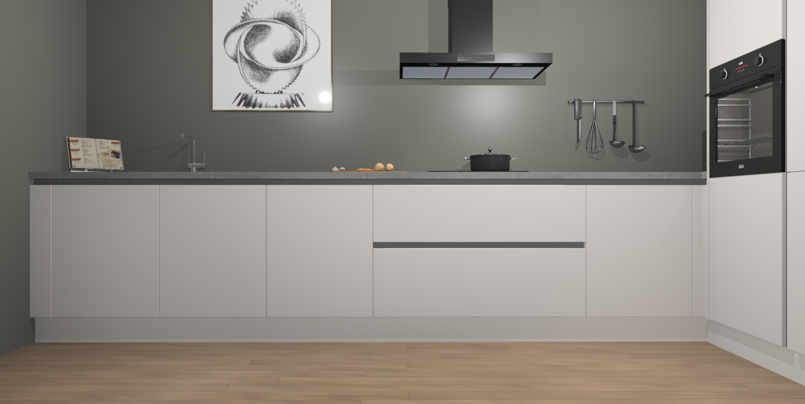 Welkom bij de Zijdegrijze greeploze keuken Khao Lak. Deze prachtige keuken zal de komende jaren het middelpunt van de belangstelling in uw huis zijn. Uitgerust met vijf inbouwapparaten komt u nooit kookgereedschap tekort. Bovendien geeft de warme houtlook elke ruimte een uitnodigende en tijdloze uitstraling.