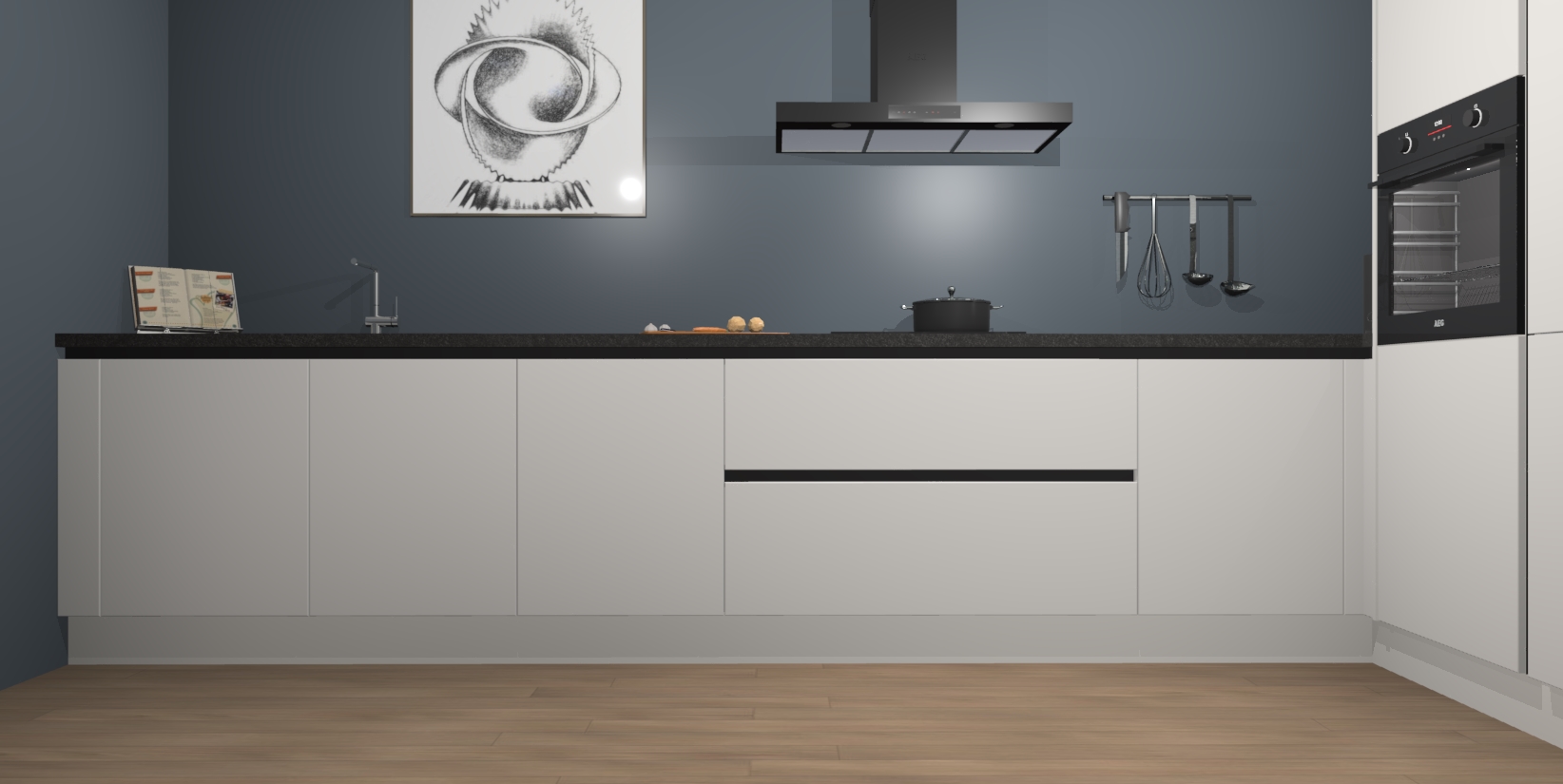 Welkom bij de Zijdegrijze greeploze keuken Khao Lak. Deze prachtige keuken zal de komende jaren het middelpunt van de belangstelling in uw huis zijn. Uitgerust met vijf inbouwapparaten komt u nooit kookgereedschap tekort. Bovendien geeft de warme houtlook elke ruimte een uitnodigende en tijdloze uitstraling.