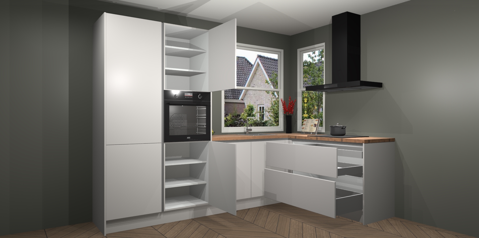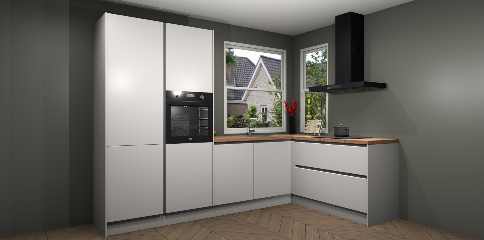 De Zijdegrijze greeploze keuken Kotor wordt geleverd met vijf inbouwapparaten, waaronder een oven, inductiekookplaat, afzuigkap, vaatwasser en koelkast. En als u uw apparatuur wilt upgraden, kunnen we u na bestelling eenvoudig helpen overstappen naar AEG. Bovendien heeft deze keuken soft close deuren, zodat lades en kastjes geruisloos en zonder klepperen sluiten!