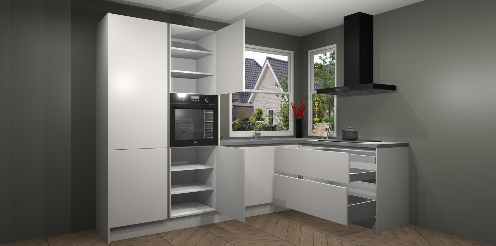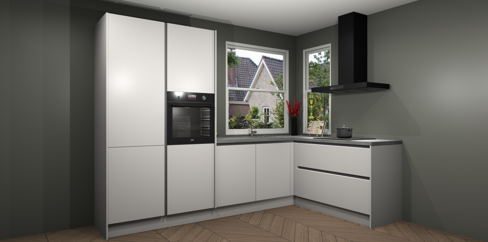 De Zijdegrijze greeploze keuken Kotor wordt geleverd met vijf inbouwapparaten, waaronder een oven, inductiekookplaat, afzuigkap, vaatwasser en koelkast. En als u uw apparatuur wilt upgraden, kunnen we u na bestelling eenvoudig helpen overstappen naar AEG. Bovendien heeft deze keuken soft close deuren, zodat lades en kastjes geruisloos en zonder klepperen sluiten!