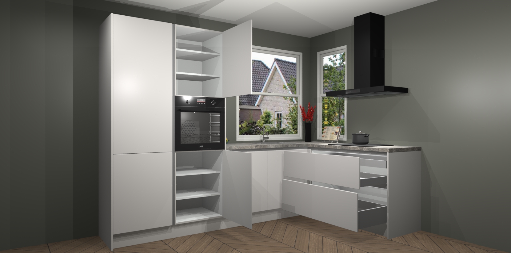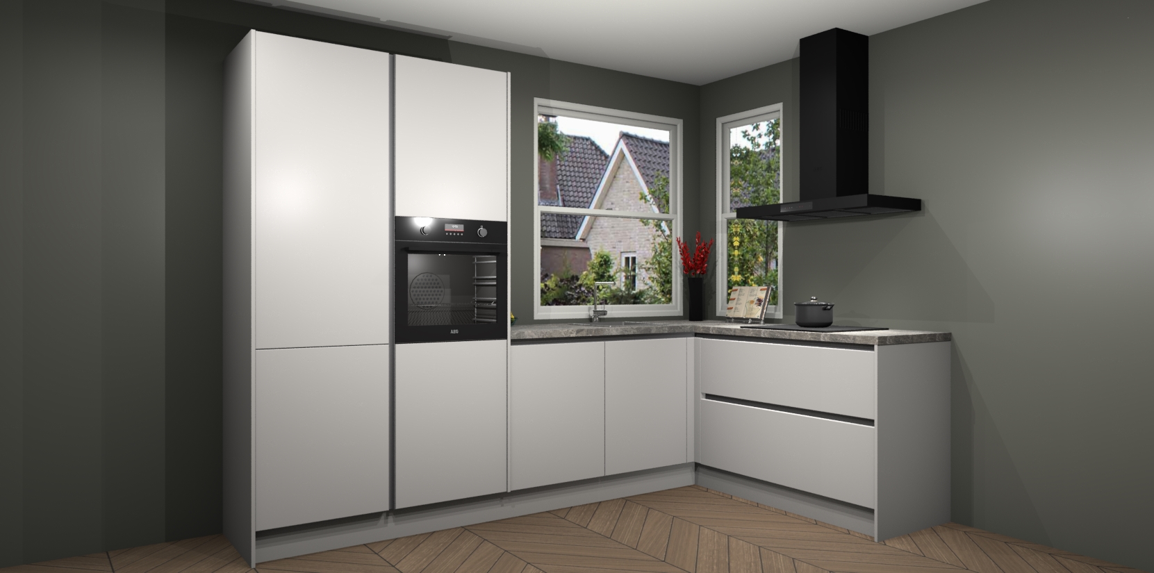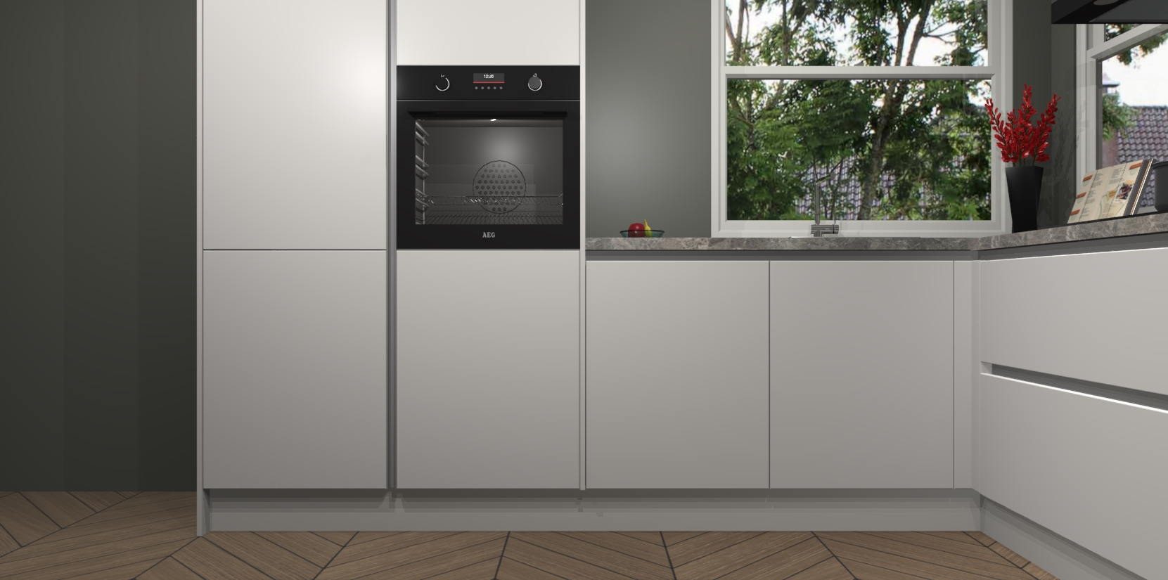 De Zijdegrijze greeploze keuken Kotor wordt geleverd met vijf inbouwapparaten, waaronder een oven, inductiekookplaat, afzuigkap, vaatwasser en koelkast. En als u uw apparatuur wilt upgraden, kunnen we u na bestelling eenvoudig helpen overstappen naar AEG. Bovendien heeft deze keuken soft close deuren, zodat lades en kastjes geruisloos en zonder klepperen sluiten!