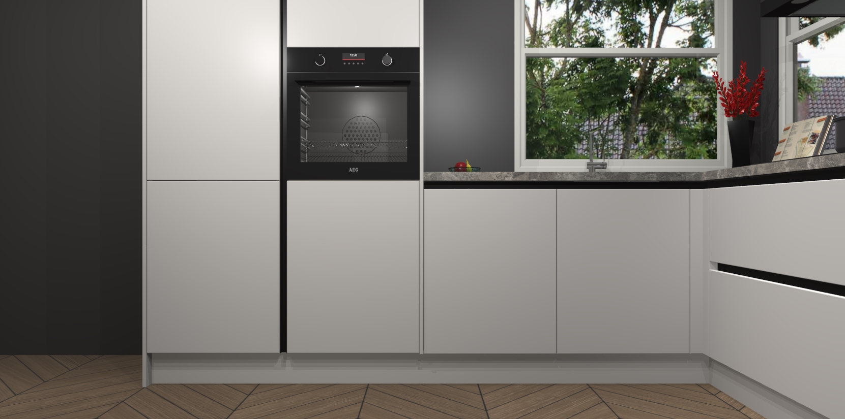 De Zijdegrijze greeploze keuken Kotor wordt geleverd met vijf inbouwapparaten, waaronder een oven, inductiekookplaat, afzuigkap, vaatwasser en koelkast. En als u uw apparatuur wilt upgraden, kunnen we u na bestelling eenvoudig helpen overstappen naar AEG. Bovendien heeft deze keuken soft close deuren, zodat lades en kastjes geruisloos en zonder klepperen sluiten!