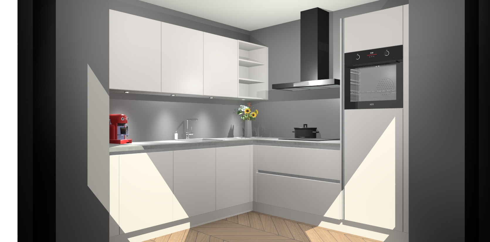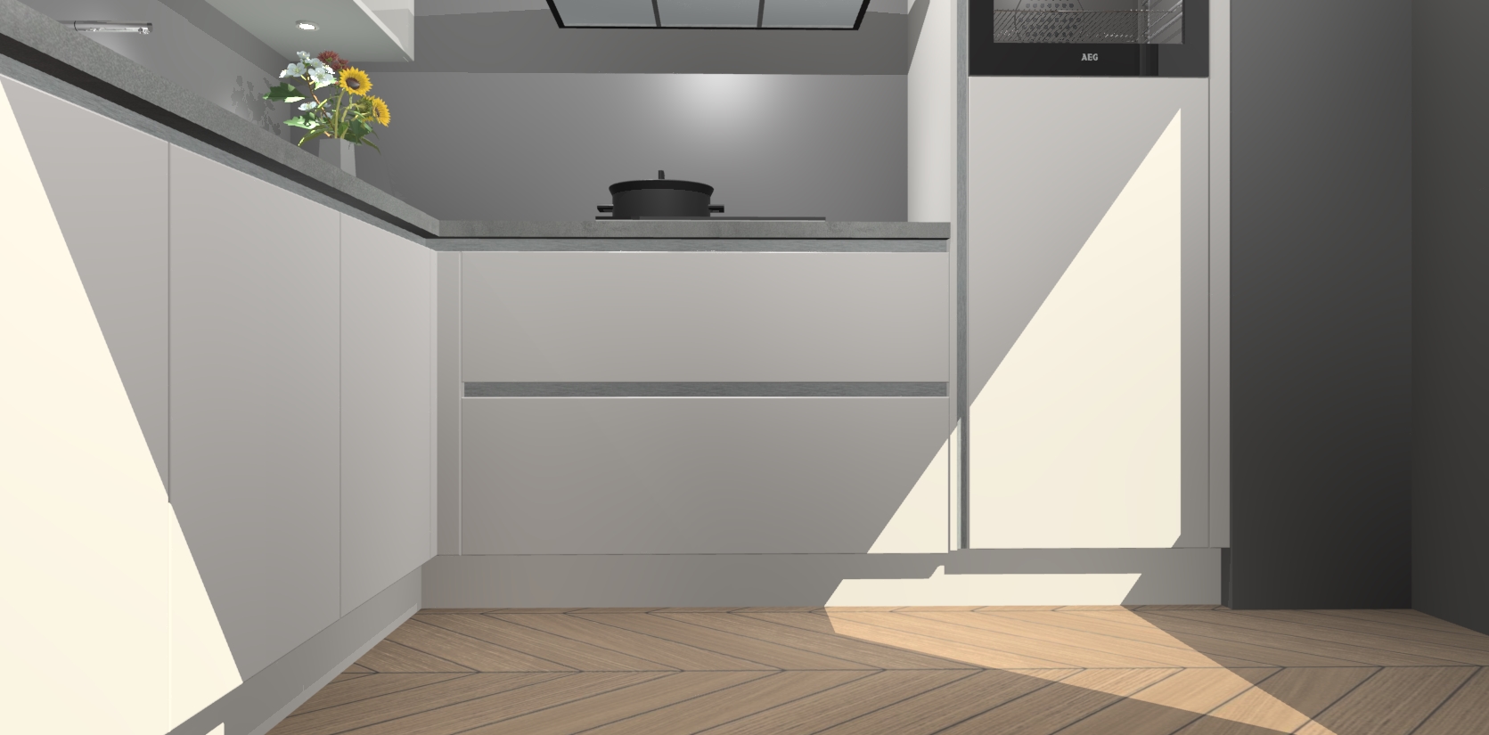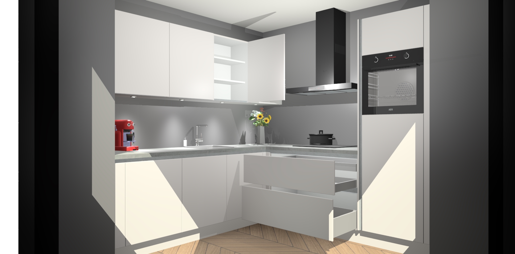 Met een modern, tijdloos design en ruime opslagruimte, zult u zich in no-time thuis voelen in uw nieuwe keuken. Uw leven wordt eenvoudiger met de soft-close deuren die voor het ultieme stille comfort zorgen - geen geluid dat u stoort terwijl u kookt. Ook is de keuken voorzien van 5 ingebouwde apparaten: een oven, inductie kookplaat, afzuigkap, vaatwasser en koelkast. Deze kunnen gemakkelijk na bestelling worden bijgewerkt naar AEG - waardoor uw luxe ervaring compleet is.