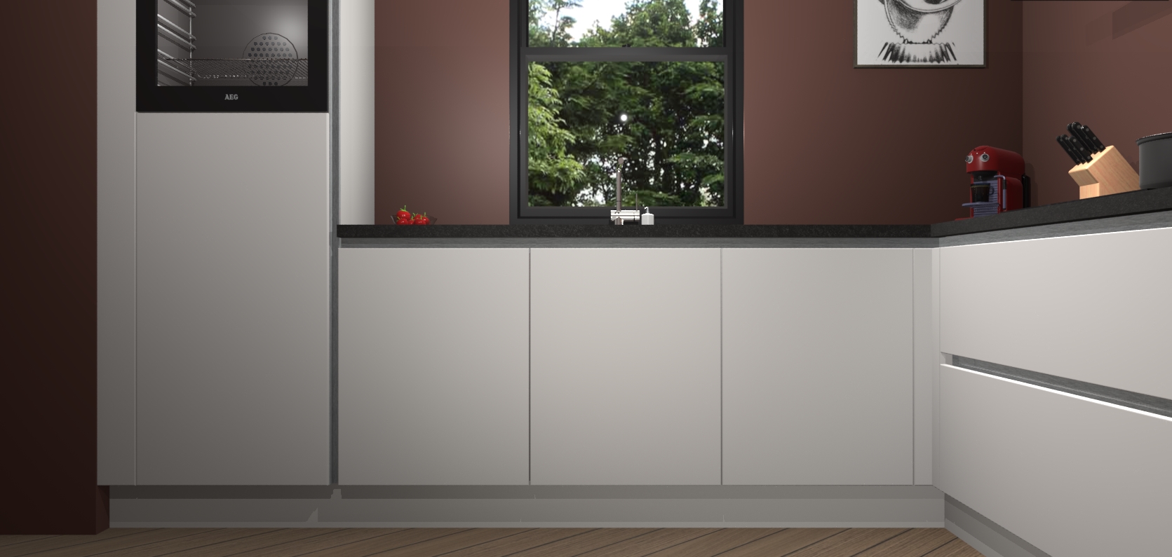 Welkom bij de zijdegrijze greeploze keuken Lublin. Deze prachtige keuken zal de komende jaren het middelpunt van de belangstelling in uw huis zijn. Uitgerust met vijf inbouwapparaten komt u nooit kookgereedschap tekort. Bovendien geeft de warme houtlook elke ruimte een uitnodigende en tijdloze uitstraling.