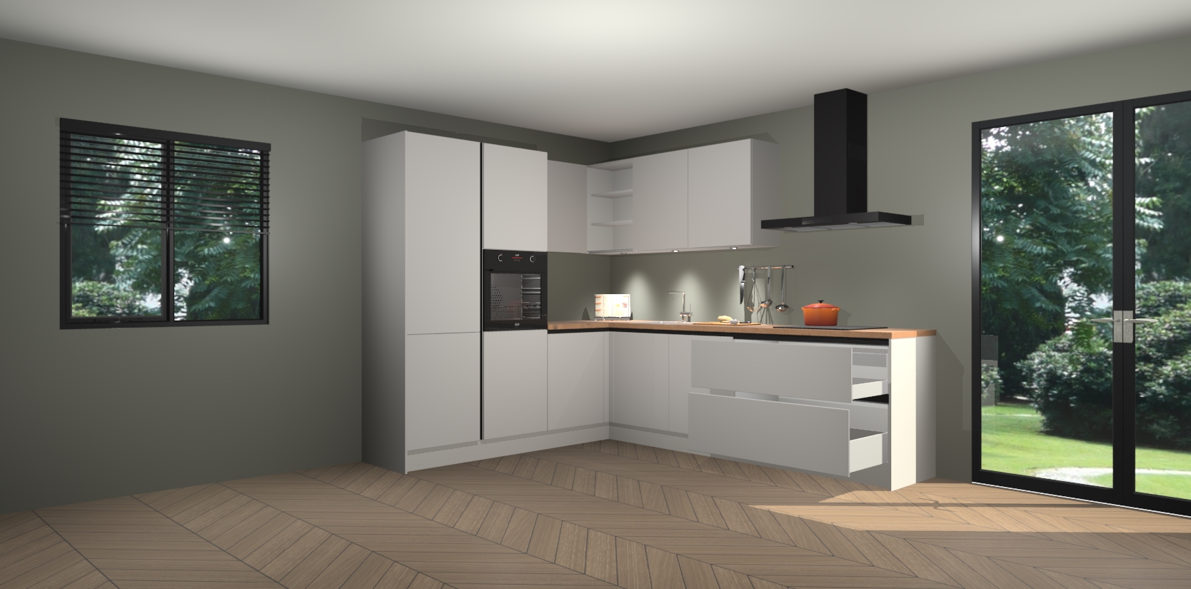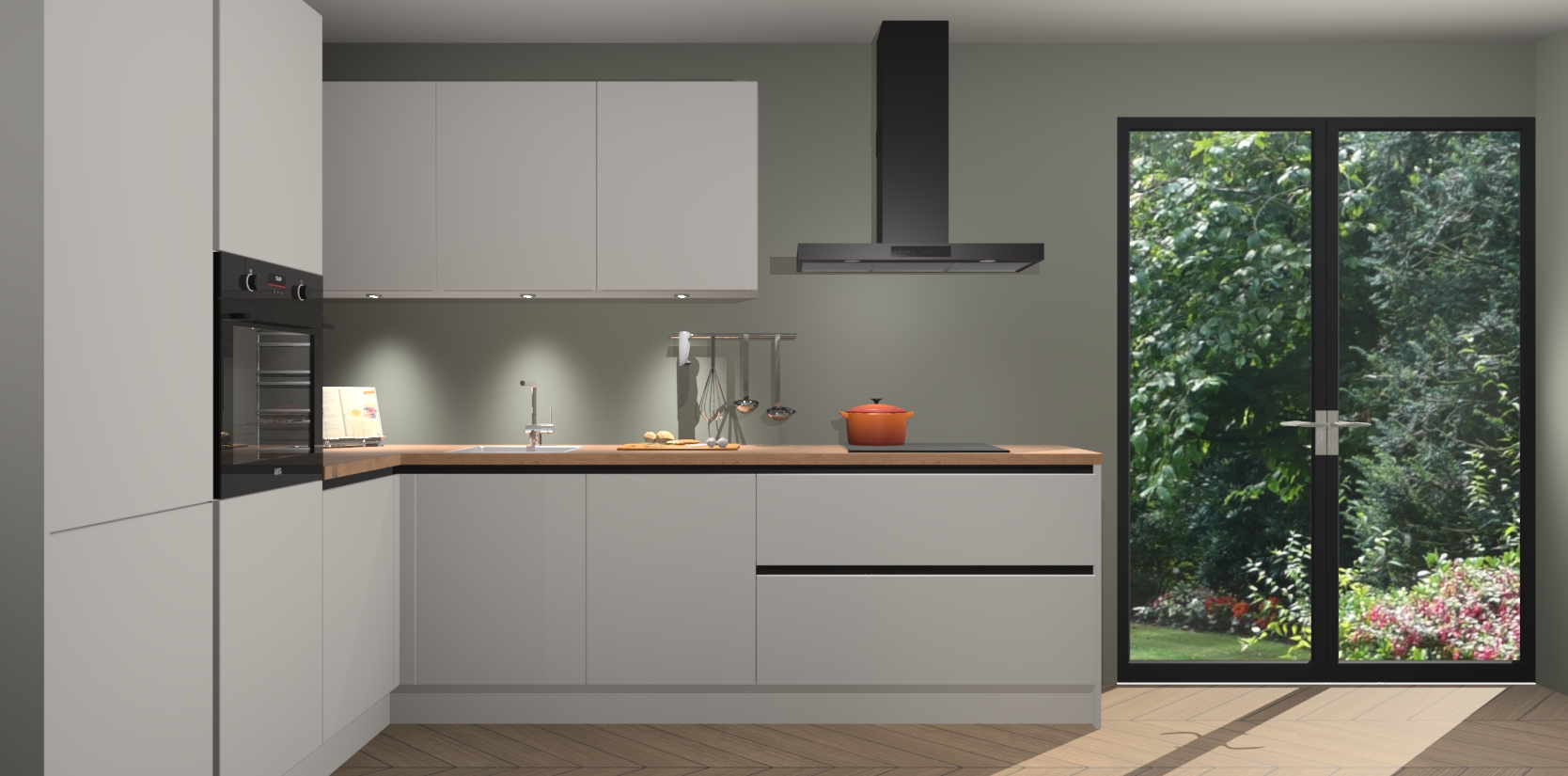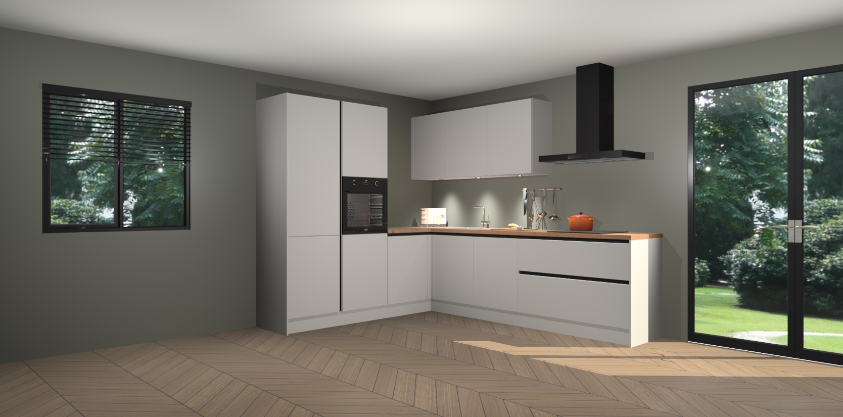 Maak kennis met de zijdegrijze greeploze keuken Parla - de perfecte aanvulling voor uw moderne keuken! Ervaar tijdloos design, elegantie en een chique uitstraling met onze zwarte handgrepen, soft-close deuren en veel opbergruimte. Dit alles wordt aangeboden tegen een vaste lage prijs voor ongeëvenaarde Duitse keukenkwaliteit!