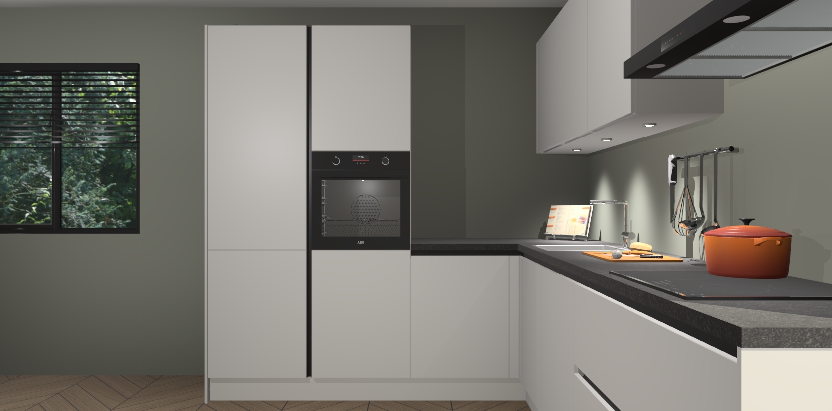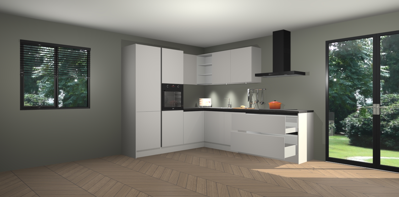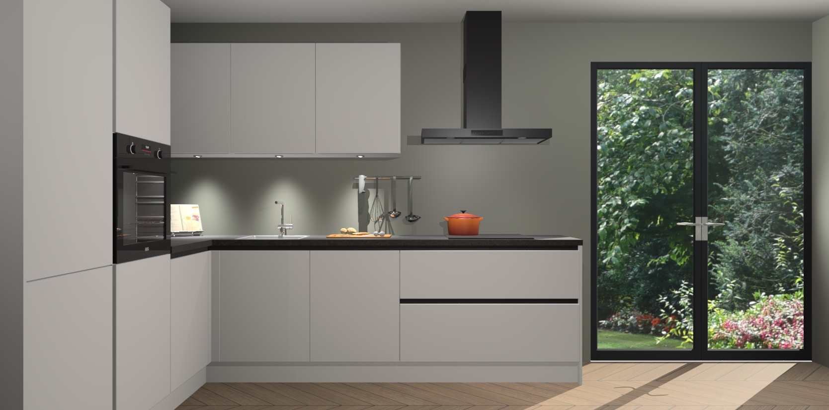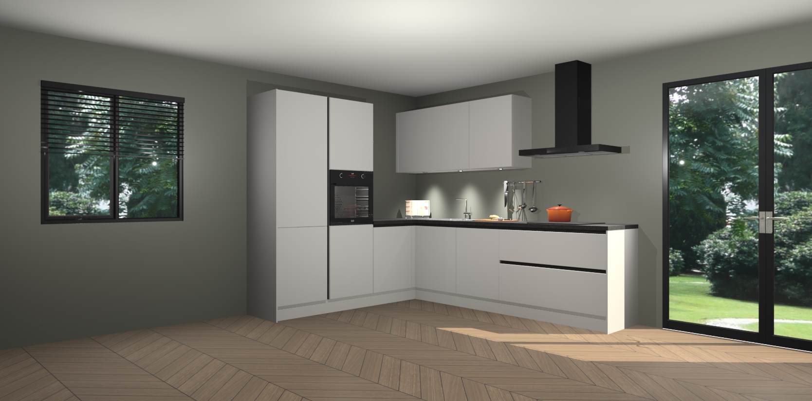 Maak kennis met de zijdegrijze greeploze keuken Parla - de perfecte aanvulling voor uw moderne keuken! Ervaar tijdloos design, elegantie en een chique uitstraling met onze zwarte handgrepen, soft-close deuren en veel opbergruimte. Dit alles wordt aangeboden tegen een vaste lage prijs voor ongeëvenaarde Duitse keukenkwaliteit!