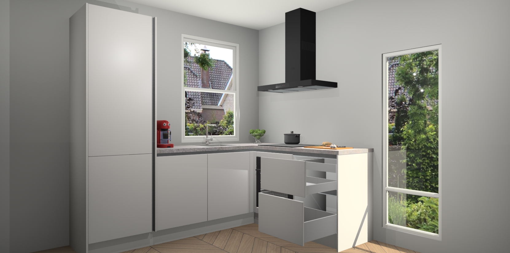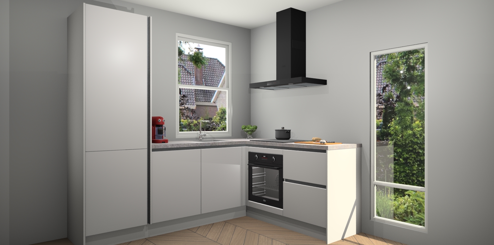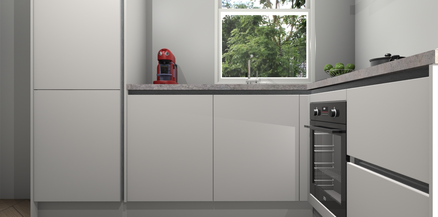 De Zijdegrijze greeploze keuken Phuket heeft alles wat u maar kunt wensen. Niet alleen zijn er softclose deuren, maar ook 5 ingebouwde apparaten: een oven, inductiekookplaat, afzuigkap, vaatwasser en koelkast - waarbij u later gemakkelijk naar het AEG merk, van inductiekookplaat naar kookplaat met geïntegreerde afzuiging of van oven naar combimagnetron kunt upgraden. Dat alles tegen een vast laag tarief! Bovendien geeft de Zijdegrijze greeploze keuken Phuket supersnelle levering van 7 weken. Echt iets voor u als u er niet op wilt wachten om het resultaat te zien in eigen keuken!