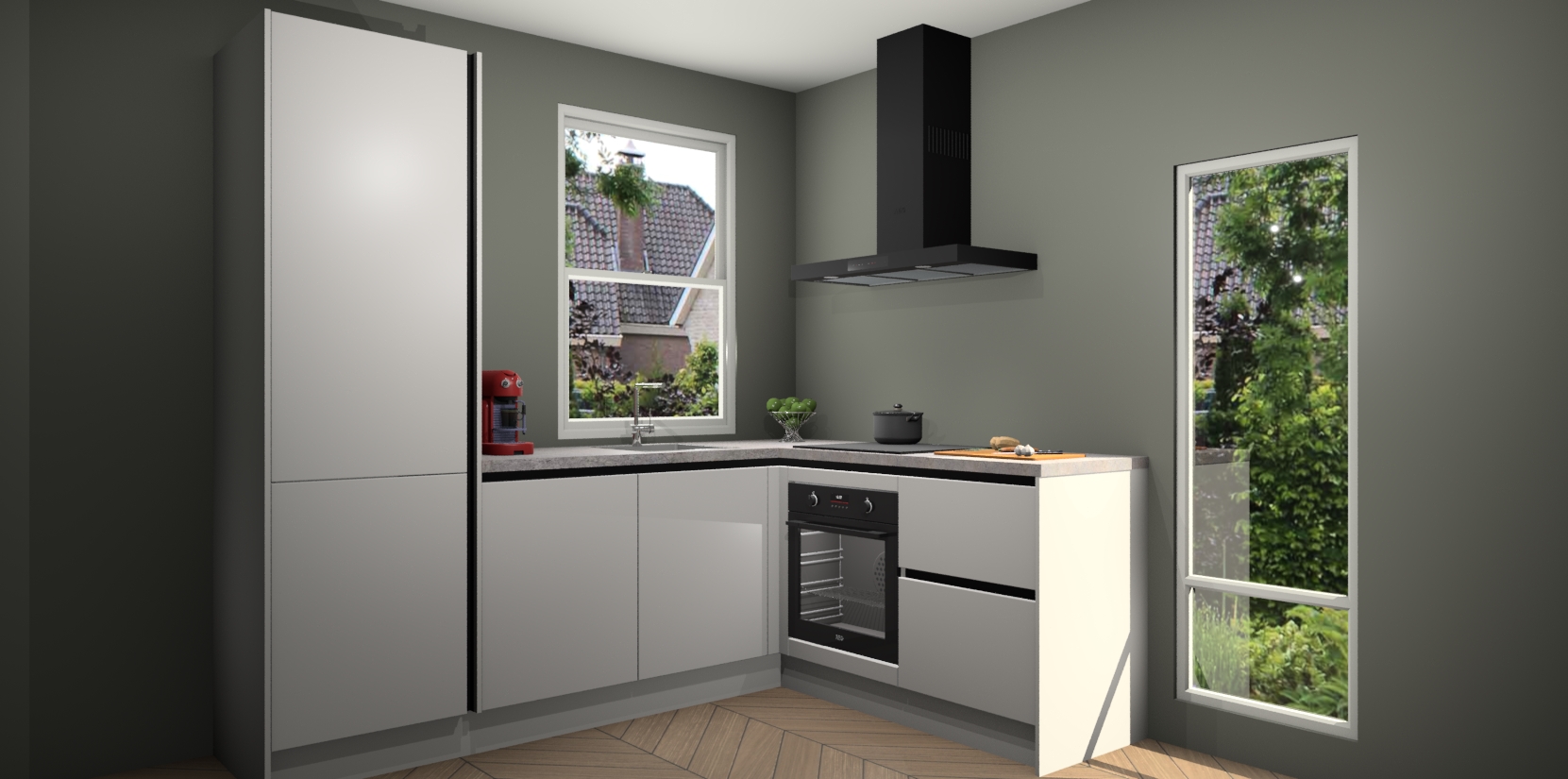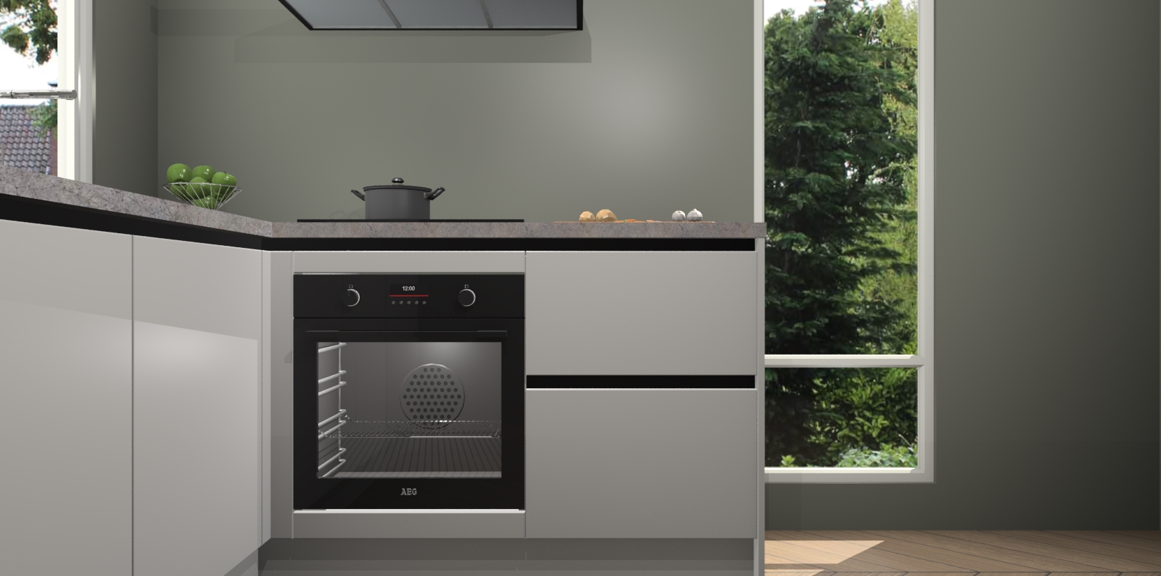 De Zijdegrijze greeploze keuken Phuket heeft alles wat u maar kunt wensen. Niet alleen zijn er softclose deuren, maar ook 5 ingebouwde apparaten: een oven, inductiekookplaat, afzuigkap, vaatwasser en koelkast - waarbij u later gemakkelijk naar het AEG merk, van inductiekookplaat naar kookplaat met geïntegreerde afzuiging of van oven naar combimagnetron kunt upgraden. Dat alles tegen een vast laag tarief! Bovendien geeft de Zijdegrijze greeploze keuken Phuket supersnelle levering van 7 weken. Echt iets voor u als u er niet op wilt wachten om het resultaat te zien in eigen keuken!