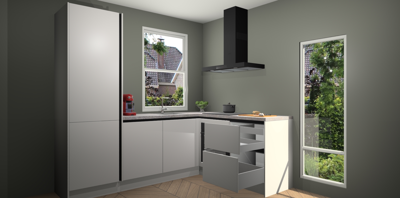 De prachtige Zijdegrijze greeploze keuken Phuket is de perfecte keuze als u op zoek bent naar een moderne hoekkeuken met alle luxe en comfort die u kunt verwachten! De uitstraling in het houtlook-design draagt bij aan de warme sfeer die u nu al voelt wanneer u er naar kijkt. Heeft u genoeg van ouderwetse keukens? Probeer dan direct deze moderne, mooie hoekkeukens en laat iedereen verbluft achter!