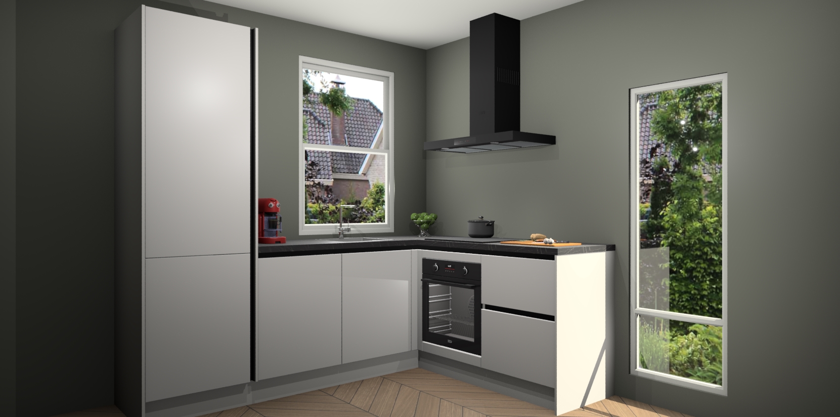 De Zijdegrijze greeploze keuken Phuket heeft alles wat u maar kunt wensen. Niet alleen zijn er softclose deuren, maar ook 5 ingebouwde apparaten: een oven, inductiekookplaat, afzuigkap, vaatwasser en koelkast - waarbij u later gemakkelijk naar het AEG merk, van inductiekookplaat naar kookplaat met geïntegreerde afzuiging of van oven naar combimagnetron kunt upgraden. Dat alles tegen een vast laag tarief! Bovendien geeft de Zijdegrijze greeploze keuken Phuket supersnelle levering van 7 weken. Echt iets voor u als u er niet op wilt wachten om het resultaat te zien in eigen keuken!