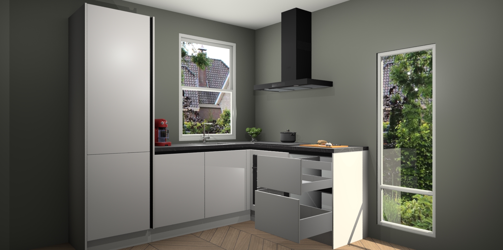 De prachtige Zijdegrijze greeploze keuken Phuket is de perfecte keuze als u op zoek bent naar een moderne hoekkeuken met alle luxe en comfort die u kunt verwachten! De uitstraling in het houtlook-design draagt bij aan de warme sfeer die u nu al voelt wanneer u er naar kijkt. Heeft u genoeg van ouderwetse keukens? Probeer dan direct deze moderne, mooie hoekkeukens en laat iedereen verbluft achter!