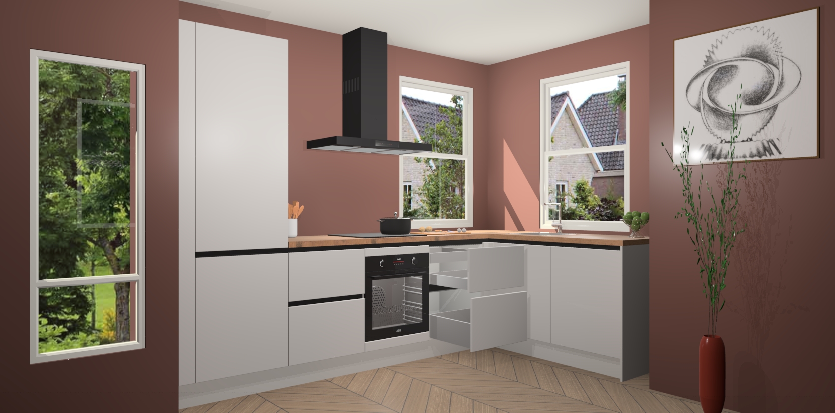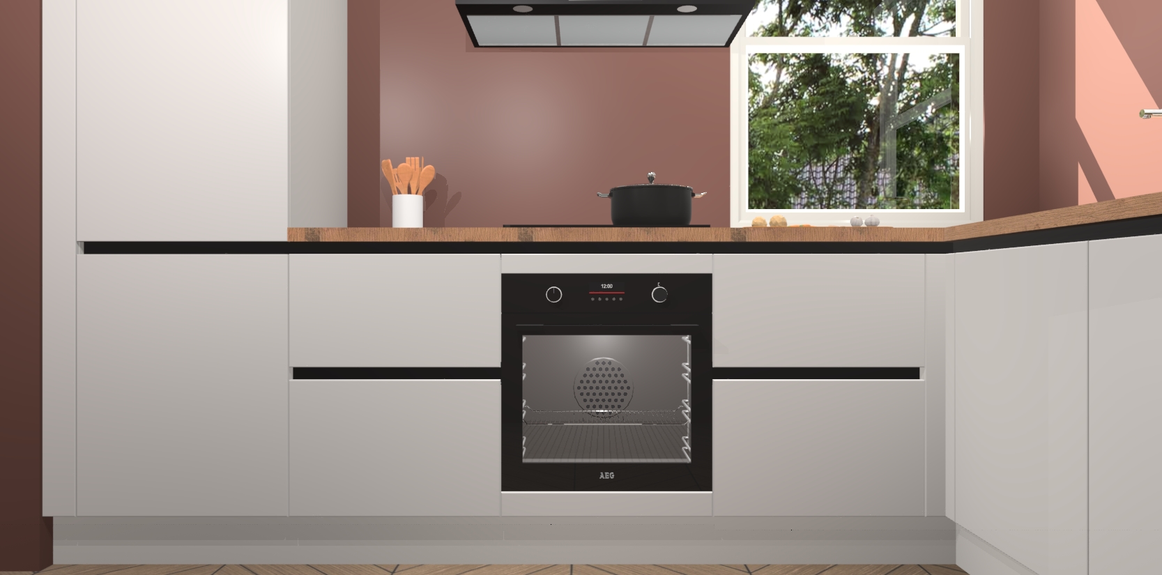 Wat maakt deze keuken zo bijzonder? Ten eerste geeft het houten werkblad uw ruimte een onmiskenbaar klassieke uitstraling. De natuurlijke afwerking roept warmte en elegantie op die nooit uit de mode zullen raken. Bovendien is het gemakkelijk schoon te houden en te onderhouden, zodat je er jarenlang plezier van kunt hebben. Als u op zoek bent naar extra gemak in uw keuken, dan heeft u bij het plaatsen van een bestelling bij ons ook de optie om uw toestellen te upgraden naar AEG-modellen - zo haalt u moderne innovatie van topmerken in apparatentechnologie rechtstreeks in huis.
