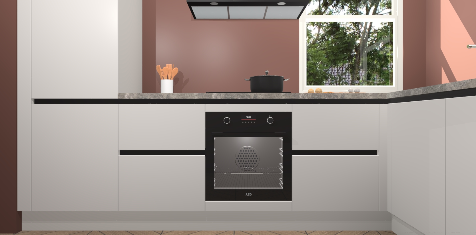 Wat maakt deze keuken zo bijzonder? Ten eerste geeft het houten werkblad uw ruimte een onmiskenbaar klassieke uitstraling. De natuurlijke afwerking roept warmte en elegantie op die nooit uit de mode zullen raken. Bovendien is het gemakkelijk schoon te houden en te onderhouden, zodat je er jarenlang plezier van kunt hebben. Als u op zoek bent naar extra gemak in uw keuken, dan heeft u bij het plaatsen van een bestelling bij ons ook de optie om uw toestellen te upgraden naar AEG-modellen - zo haalt u moderne innovatie van topmerken in apparatentechnologie rechtstreeks in huis.
