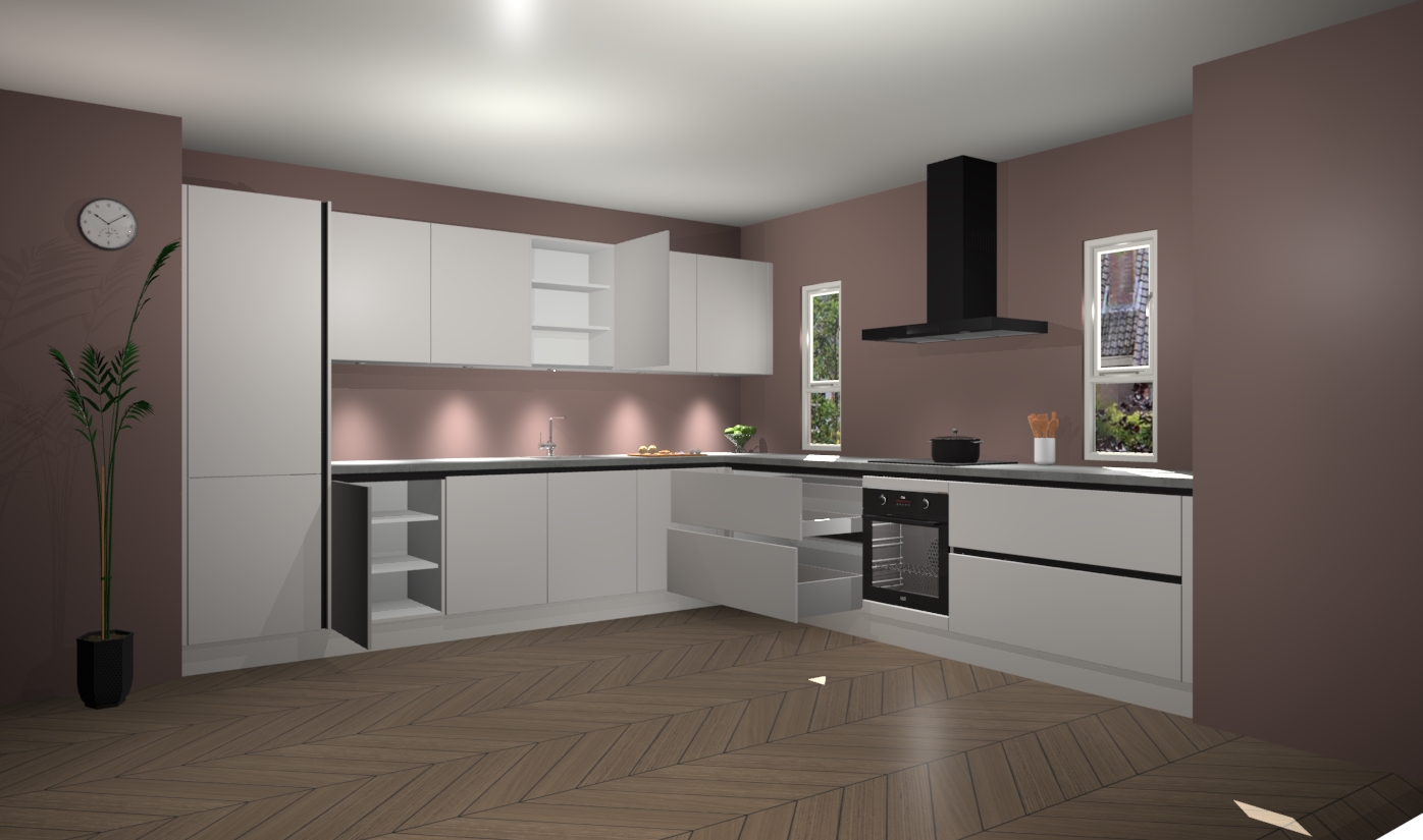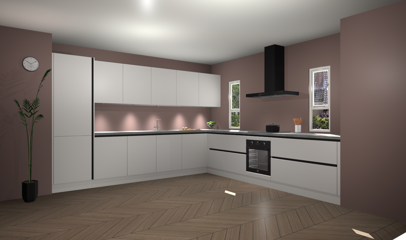 De zijdegrijze greeploze keuken is een ideale hoekkeuken en heeft alle functies en apparatuur die u maar nodig kunt hebben. Bij de bestelling krijgt u een oven, inductiekookplaat, afzuigkap, vaatwasser en koelkast - deze kunnen desgewenst eenvoudig worden uitgebreid naar AEG na bestellen. Elke kast wordt ook voor gemonteerd geleverd met soft close deuren die jarenlang gebruik beloven. Stelt u zich voor dat u geen gedoe heeft met vervelende montage - vanaf het moment dat u uw bestelling plaats, duurt het slechts 7 weken voor het bij u thuis geleverd wordt.