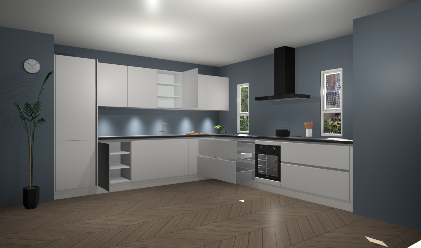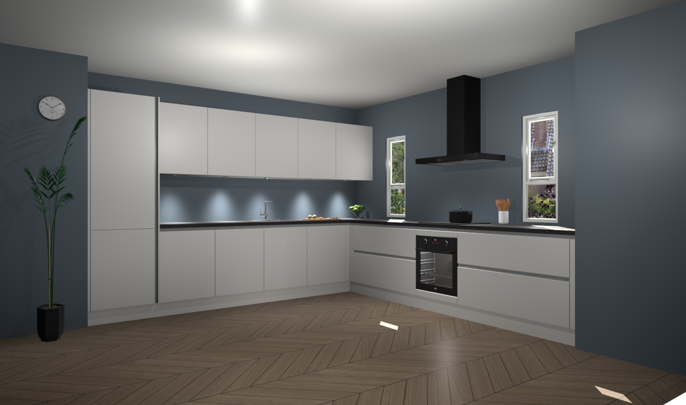 De zijdegrijze greeploze keuken is een ideale hoekkeuken en heeft alle functies en apparatuur die u maar nodig kunt hebben. Bij de bestelling krijgt u een oven, inductiekookplaat, afzuigkap, vaatwasser en koelkast - deze kunnen desgewenst eenvoudig worden uitgebreid naar AEG na bestellen. Elke kast wordt ook voor gemonteerd geleverd met soft close deuren die jarenlang gebruik beloven. Stelt u zich voor dat u geen gedoe heeft met vervelende montage - vanaf het moment dat u uw bestelling plaats, duurt het slechts 7 weken voor het bij u thuis geleverd wordt.
