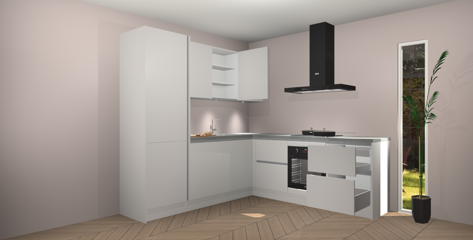 Met zijn moderne design en aantrekkelijke hoekopstelling biedt deze keuken een unieke look die zelfs de meest veeleisende huiseigenaar zal bevallen. En omdat de binnenkant van de kasten dezelfde kleur heeft als de buitenkant, heeft uw keuken een consistente afwerking. Bovenop de geweldige look is opbergruimte ook geen probleem, met voldoende kast- en laderuimte achter zelfs de mooiste buitenkant.