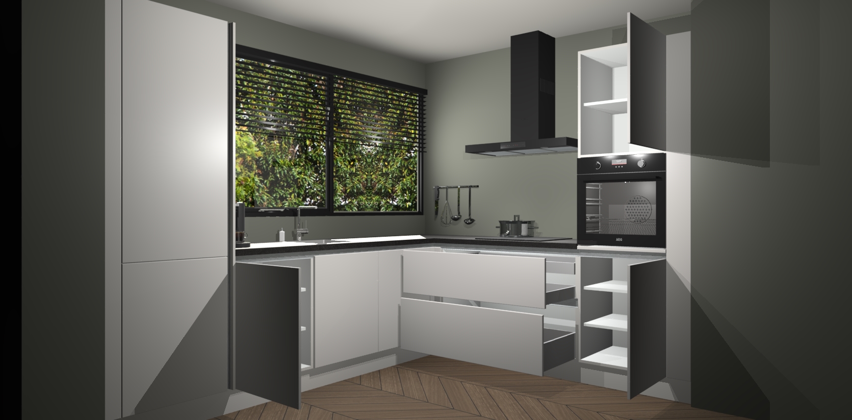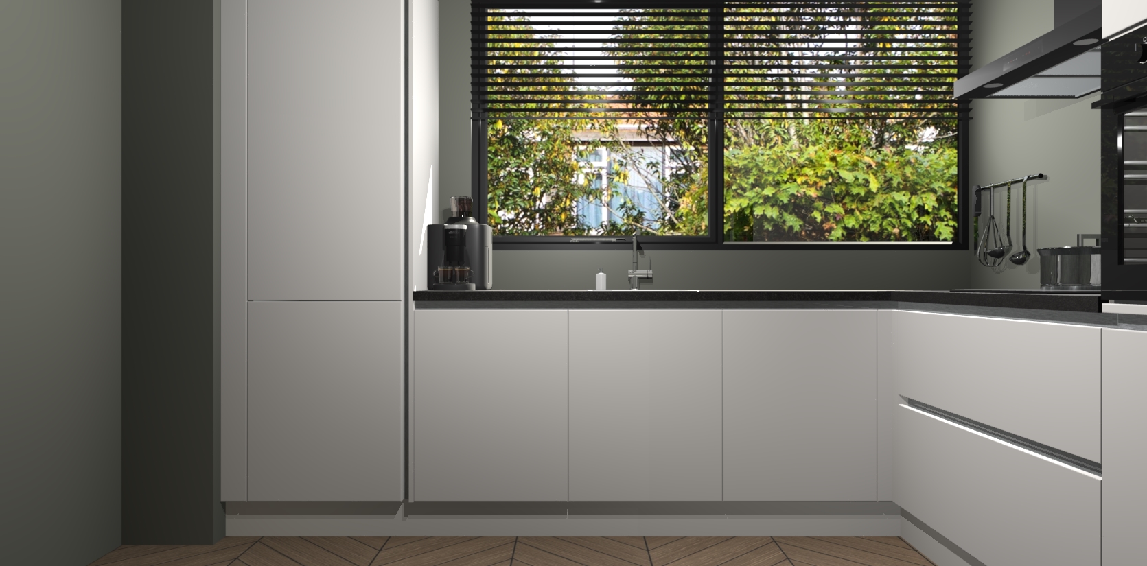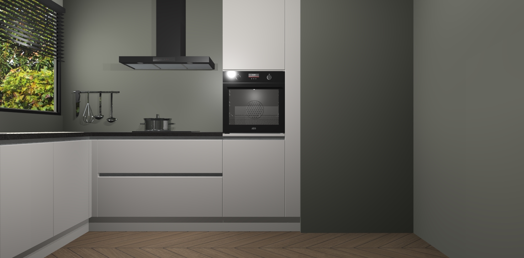 Met een modern, tijdloos design en ruime opslagruimte, zult u zich in no-time thuis voelen in uw nieuwe keuken. Uw leven wordt eenvoudiger met de soft-close deuren die voor het ultieme stille comfort zorgen - geen geluid dat u stoort terwijl u kookt. Ook is de keuken voorzien van 5 ingebouwde apparaten: een oven, inductie kookplaat, afzuigkap, vaatwasser en koelkast. Deze kunnen gemakkelijk na bestelling worden bijgewerkt naar AEG - waardoor uw luxe ervaring compleet is.