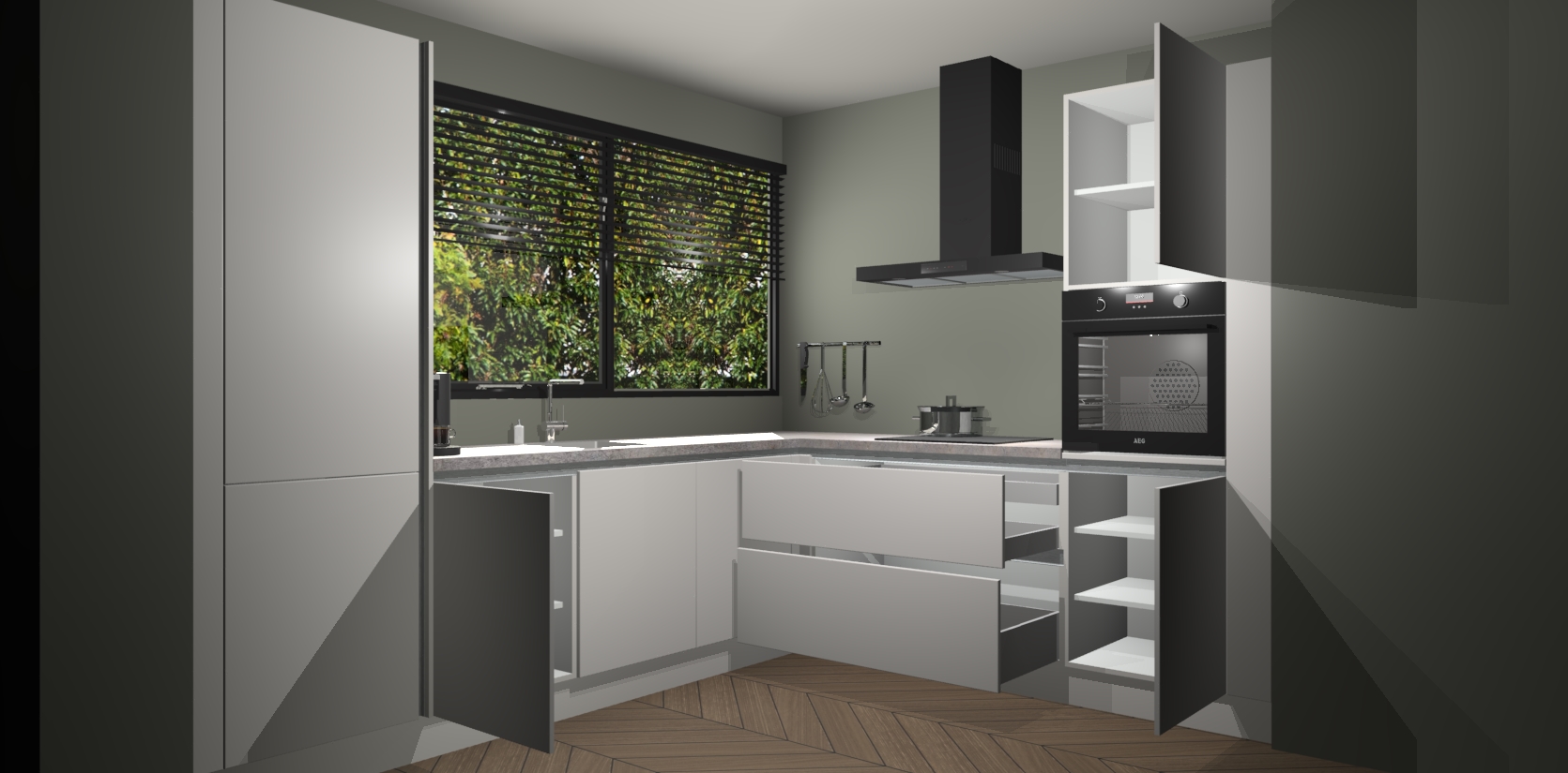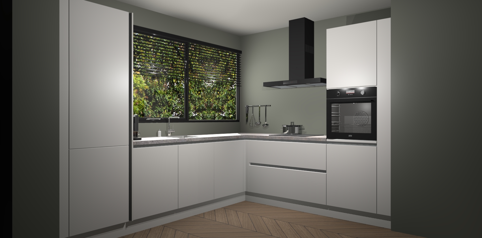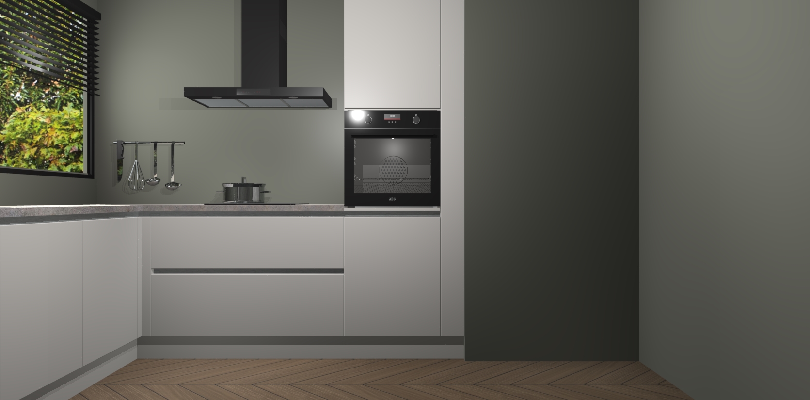 Met een modern, tijdloos design en ruime opslagruimte, zult u zich in no-time thuis voelen in uw nieuwe keuken. Uw leven wordt eenvoudiger met de soft-close deuren die voor het ultieme stille comfort zorgen - geen geluid dat u stoort terwijl u kookt. Ook is de keuken voorzien van 5 ingebouwde apparaten: een oven, inductie kookplaat, afzuigkap, vaatwasser en koelkast. Deze kunnen gemakkelijk na bestelling worden bijgewerkt naar AEG - waardoor uw luxe ervaring compleet is.
