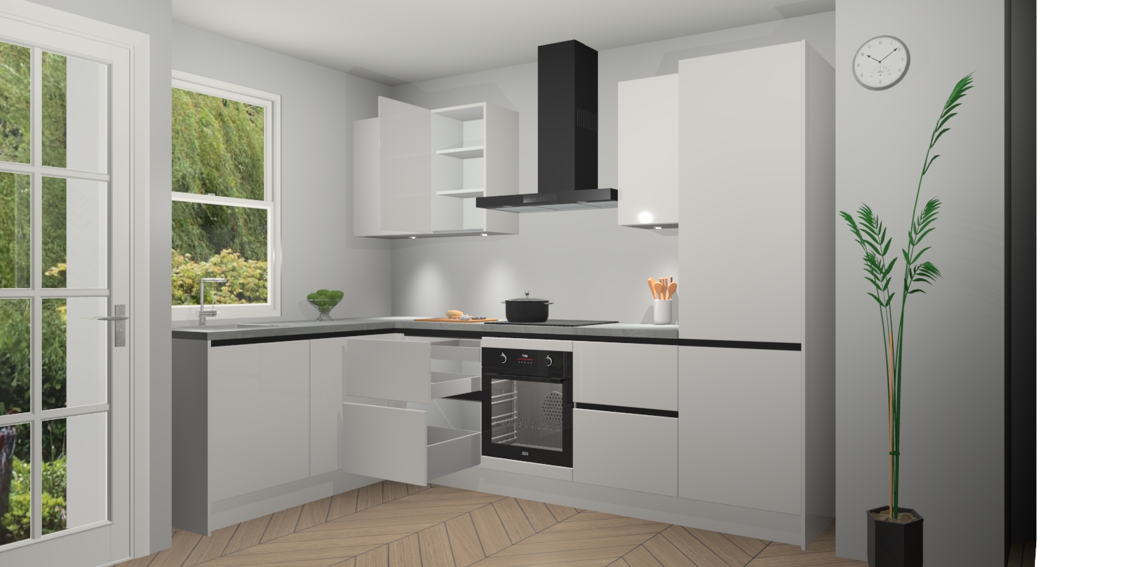 U hoeft zich ook geen zorgen te maken over een gebrek aan opbergruimte, want deze keuken heeft voldoende opbergmogelijkheden zowel boven als onder het aanrecht. Om het leven nog makkelijker te maken, wordt deze moderne hoekkeuken geleverd met 5 ingebouwde apparaten, waaronder een oven, inductiekookplaat, afzuigkap, vaatwasser en koelkast, zodat u in een mum van tijd klaar bent voor actie!