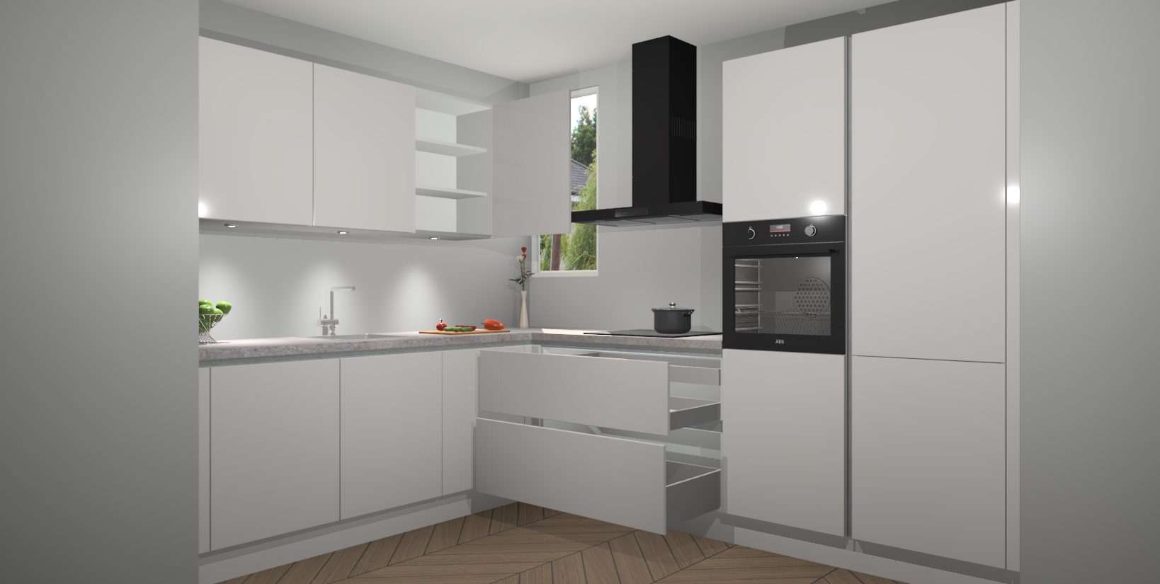 De ruime opbergruimte van dit model maakt het bereiden van voedsel en het gebruik van apparaten snel en gemakkelijk. Het beste van alles is dat het wordt geleverd met vijf inbouwapparaten: een oven, inductiekookplaat, afzuigkap, vaatwasser en koelkast - die allemaal gemakkelijk kunnen worden opgewaardeerd naar AEG na aankoop. Wat de gemaksfactor nog groter maakt, is het feit dat alle cabines voorgemonteerd worden geleverd, zodat u er meteen mee aan de slag kunt!
