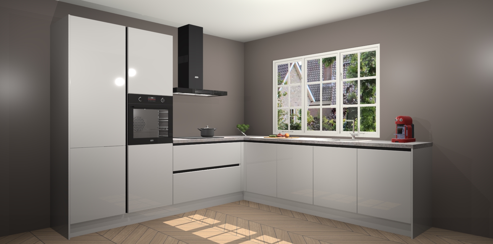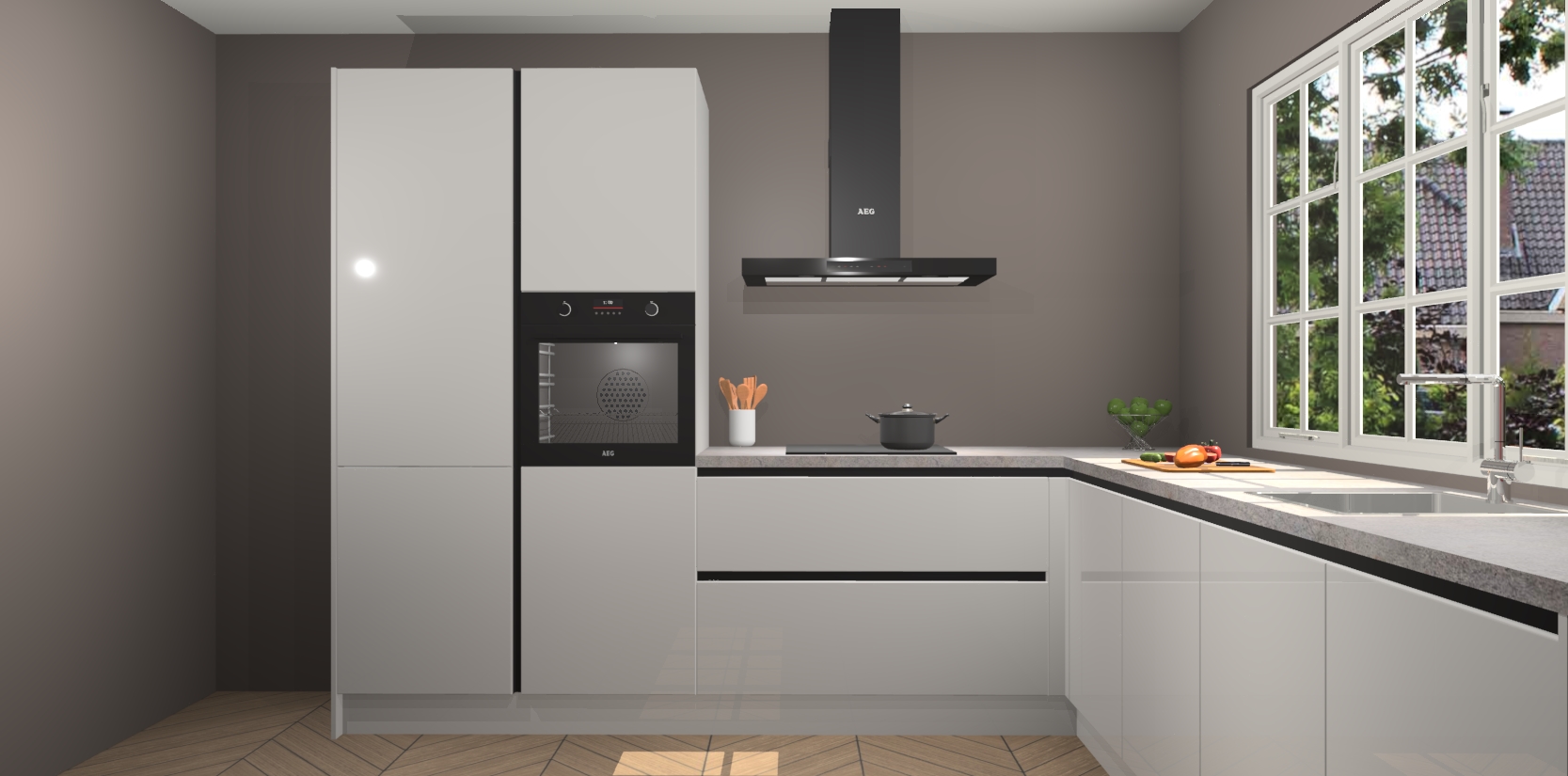 De keuken heeft veel opbergruimte, waardoor u alle ingrediënten gemakkelijk bereikbaar hebt staan. En daarnaast bevat deze volledig uitgeruste keuken ook 5 ingebouwde apparaten: een oven, inductiekookplaat, afzuigkap, vaatwasser en koelkast. Deze zijn heel eenvoudig na bestellen te upgraden naar AEG als u dit wilt. Bovendien zijn de softclose-kastdeuren ideaal; geef ze gewoon even een tikje en ze sluiten automatisch met geruisloze precisie.