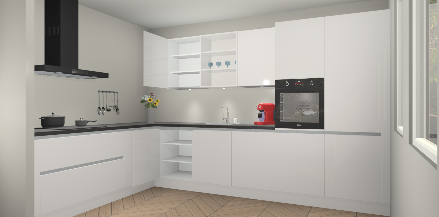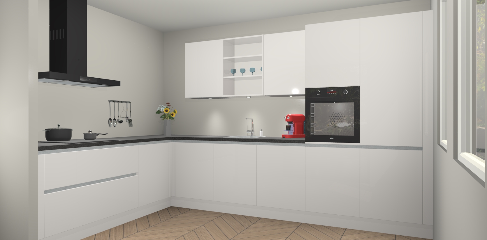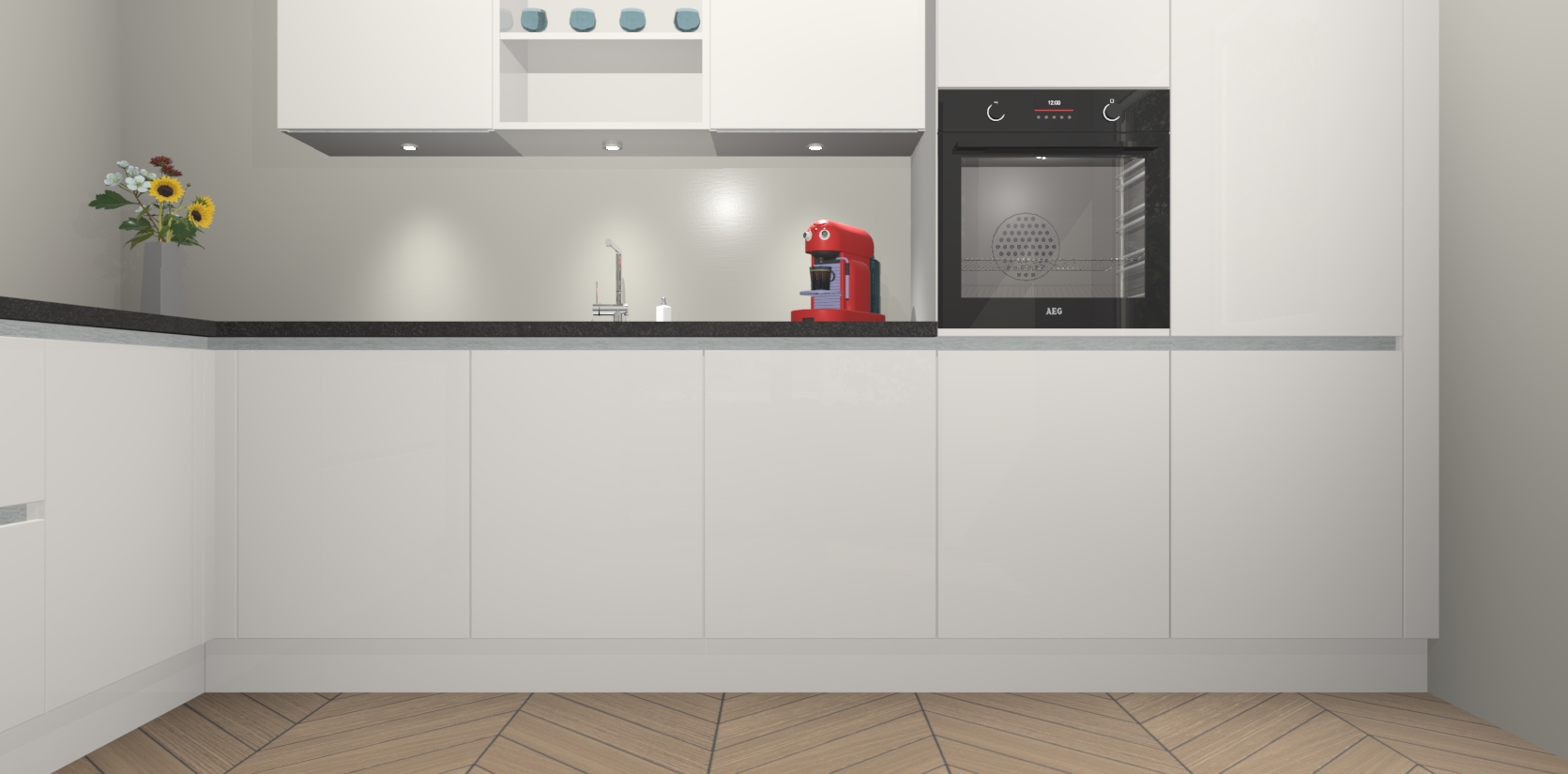 De Zijdegrijze hoogglans greeploze keuken Gotenburg is zo ontworpen dat u alle mogelijke vormen van opslagruimte kunt genieten. Bovendien heeft u meteen toegang tot vijf ingebouwde apparaten: een oven, inductiekookplaat, afzuigkap, vaatwasser en koelkast. Gewoon upgraden naar AEG na bestelling? Dit kan heel gemakkelijk worden geregeld. De deuren sluiten zacht dankzij zachtsluitende scharnieren en ze houden warmte vast terwijl ze uitzonderlijk stil blijven wanneer ze worden geopend of gesloten.