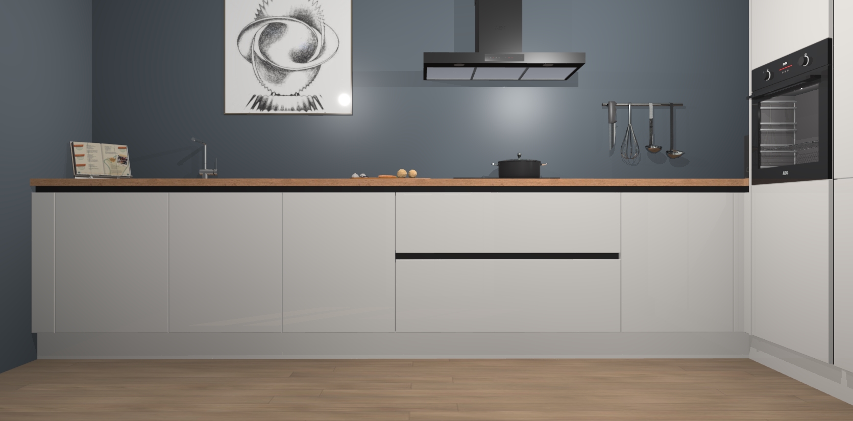 Welkom bij de Zijdegrijze hoogglans greeploze keuken Khao Lak. Deze prachtige keuken zal de komende jaren het middelpunt van de belangstelling in uw huis zijn. Uitgerust met vijf inbouwapparaten komt u nooit kookgereedschap tekort. Bovendien geeft de warme houtlook elke ruimte een uitnodigende en tijdloze uitstraling.