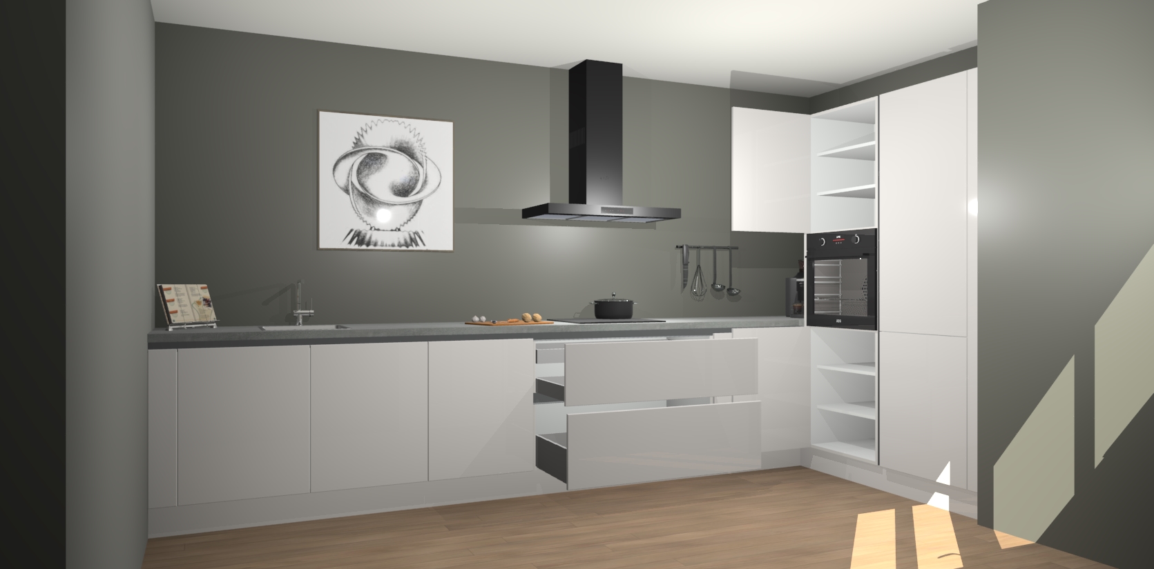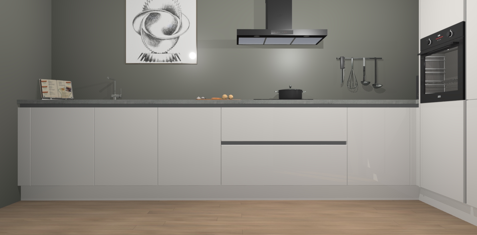 Welkom bij de Zijdegrijze hoogglans greeploze keuken Khao Lak. Deze prachtige keuken zal de komende jaren het middelpunt van de belangstelling in uw huis zijn. Uitgerust met vijf inbouwapparaten komt u nooit kookgereedschap tekort. Bovendien geeft de warme houtlook elke ruimte een uitnodigende en tijdloze uitstraling.