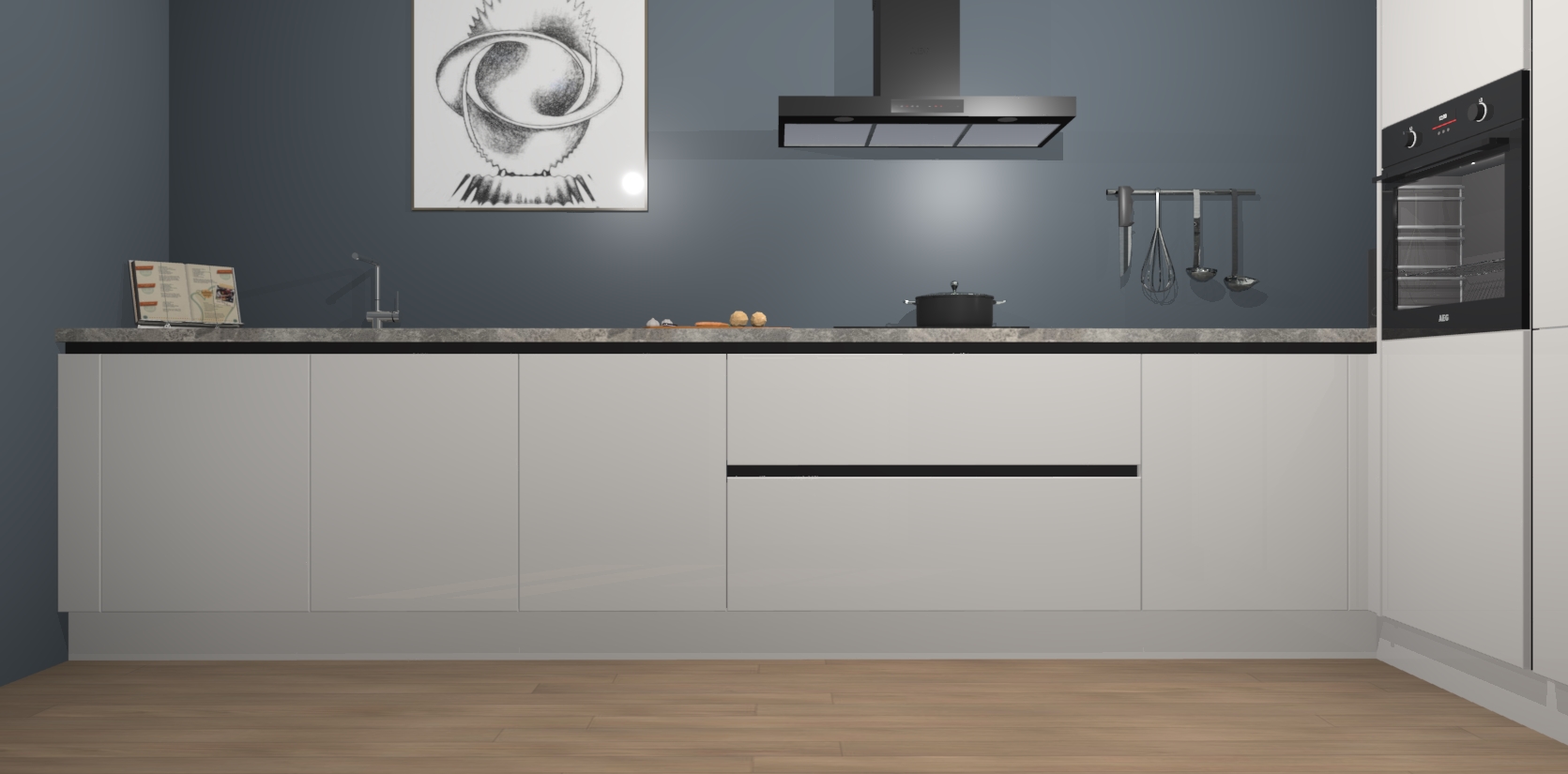 Welkom bij de Zijdegrijze hoogglans greeploze keuken Khao Lak. Deze prachtige keuken zal de komende jaren het middelpunt van de belangstelling in uw huis zijn. Uitgerust met vijf inbouwapparaten komt u nooit kookgereedschap tekort. Bovendien geeft de warme houtlook elke ruimte een uitnodigende en tijdloze uitstraling.
